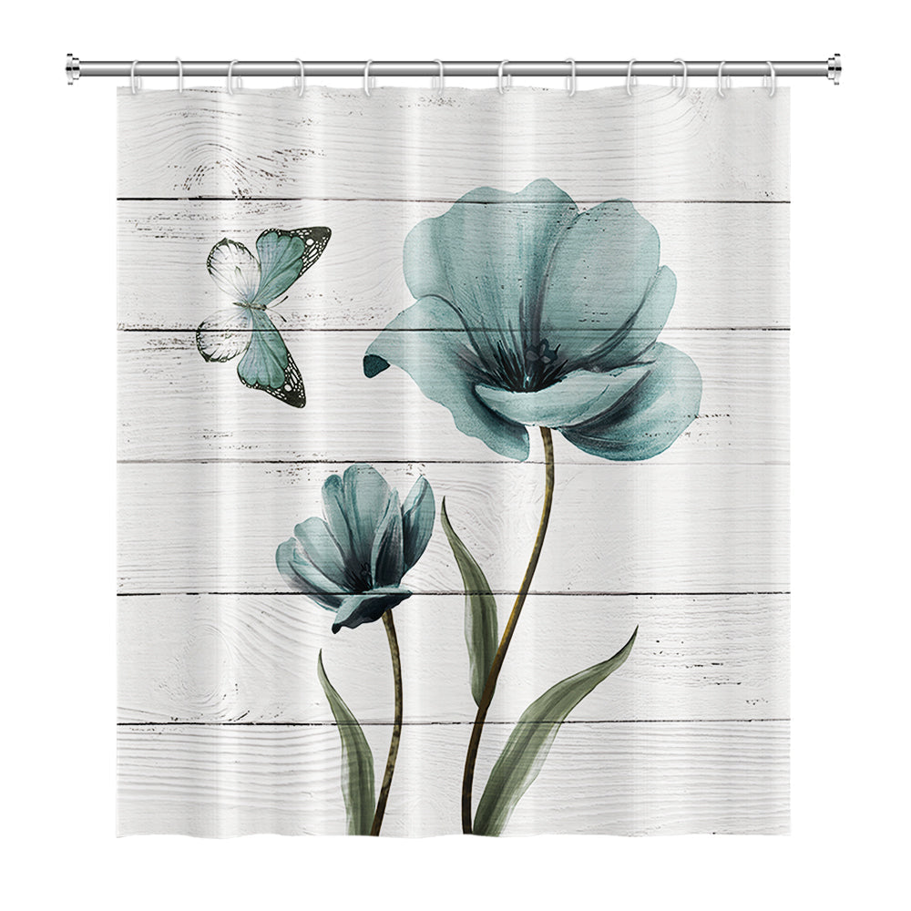 Feblilac Blue Flowers and Butterfly Shower Curtain with Hooks, Bathroom Curtains with Ring, Unique Bathroom décor, Boho Shower Curtain, Customized Bathroom Curtains, Extra Long Shower Curtain