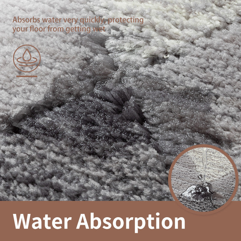 The bath mat is made of heavy-density yarn. Thick and fluffy contact surface offers exceptional comfortable feels to help soothe tired feet, and is super absorbent that helps save your floors from dripping water while you were stepping out of the bath, shower, or getting ready by the sink.