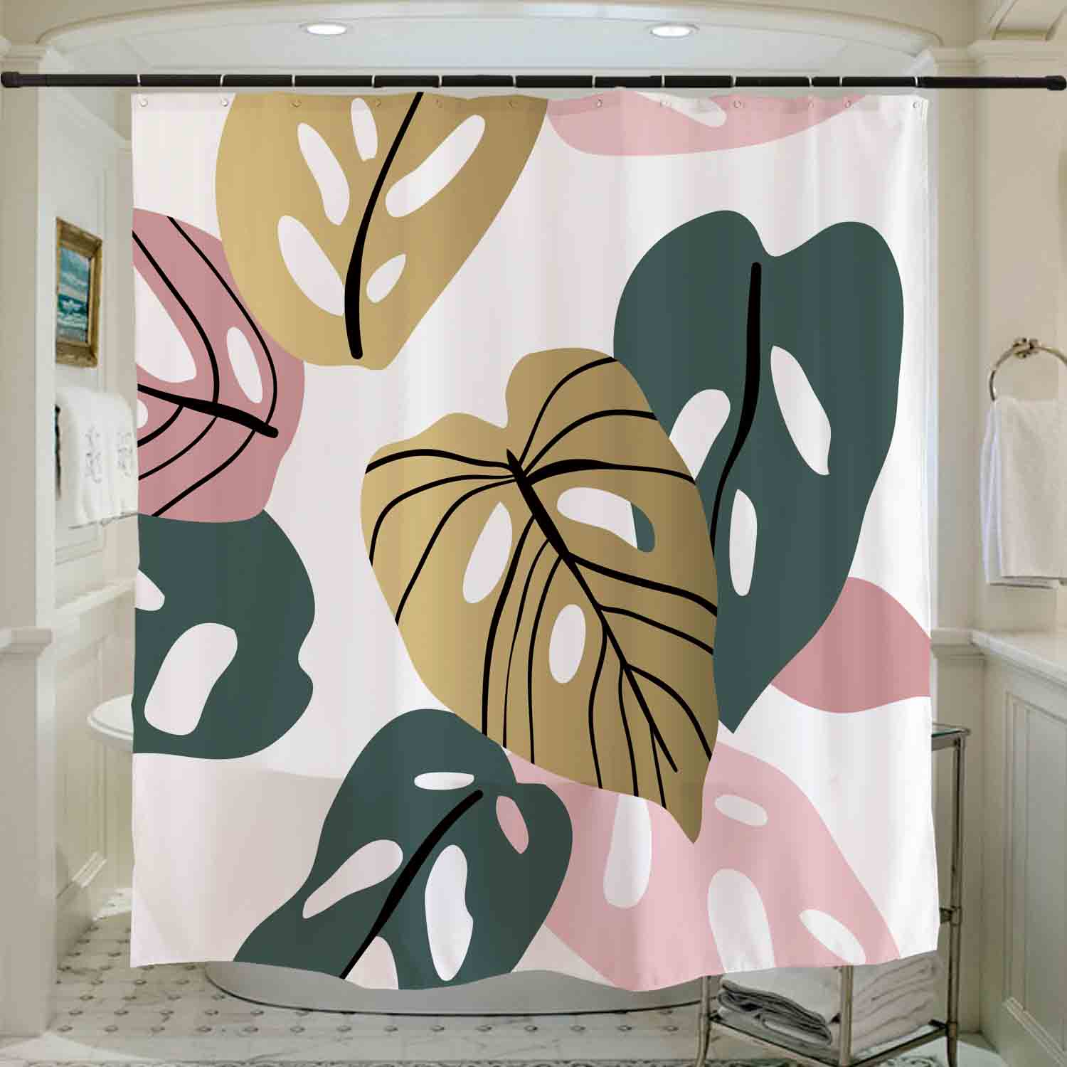 Feblilac Abstract Leaves Garden Shower Curtain with Hooks, Floral Bathroom Curtains with Ring, Unique Bathroom décor, Boho Shower Curtain, Customized Bathroom Curtains, Extra Long Shower Curtain