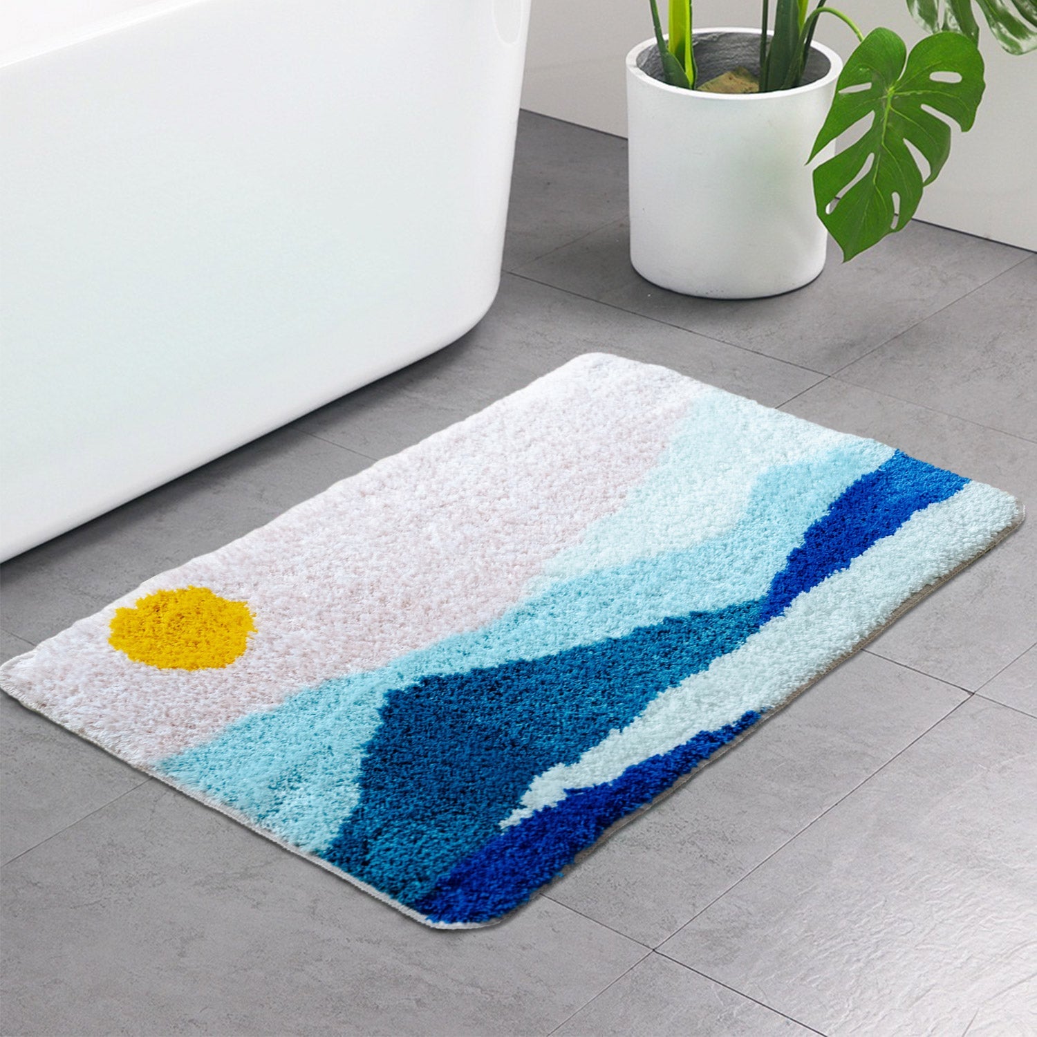 The bath mat is made of heavy-density yarn. Thick and fluffy contact surface offers exceptional comfortable feels to help soothe tired feet, and is super absorbent that helps save your floors from dripping water while you were stepping out of the bath, shower, or getting ready by the sink.