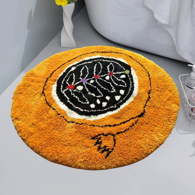 Feblilac Round Orange Background Black and White Flowers Tufted Bath Mat by Liz Gamberg Studio from US