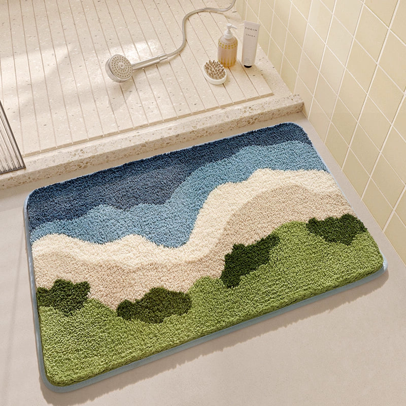 The bath mat is made of heavy-density yarn. Thick and fluffy contact surface offers exceptional comfortable feels to help soothe tired feet, and is super absorbent that helps save your floors from dripping water while you were stepping out of the bath, shower, or getting ready by the sink.