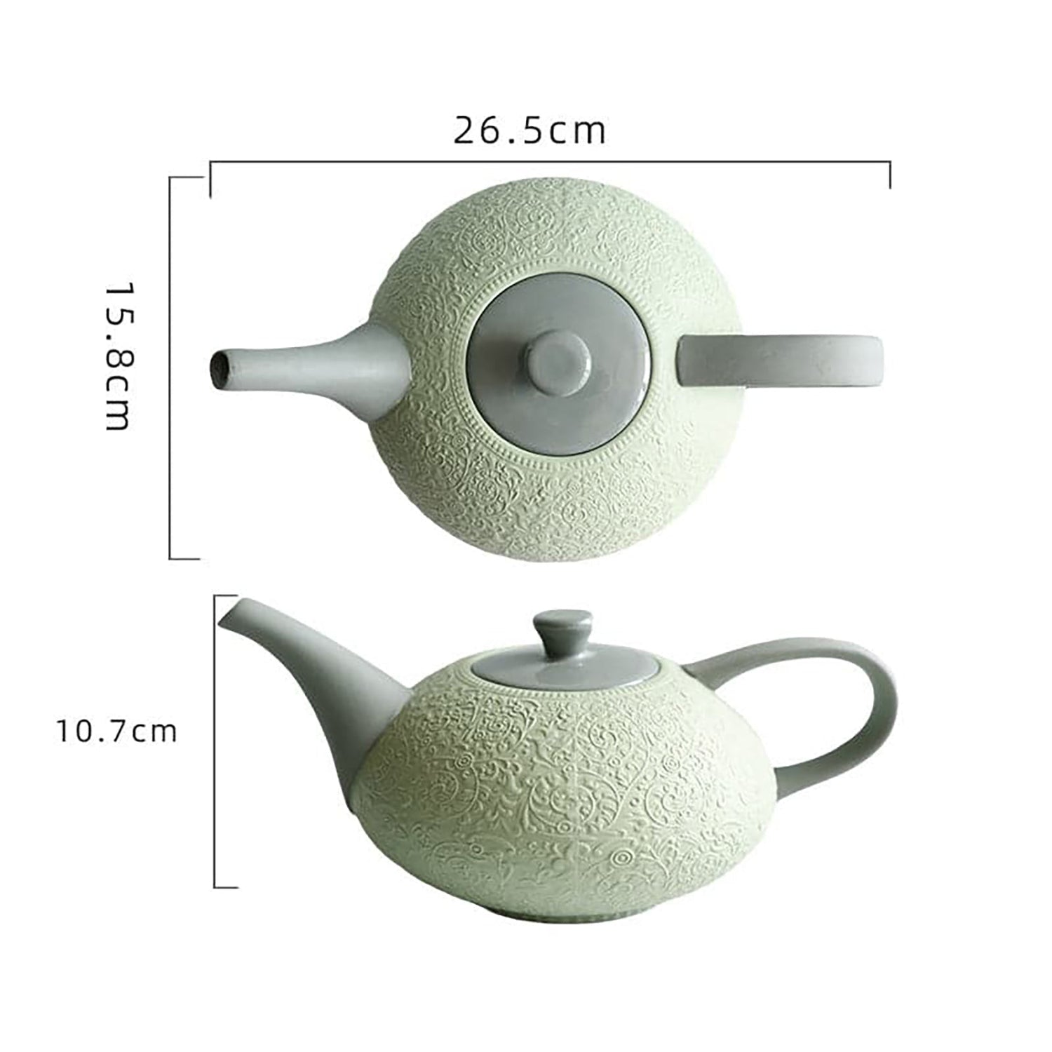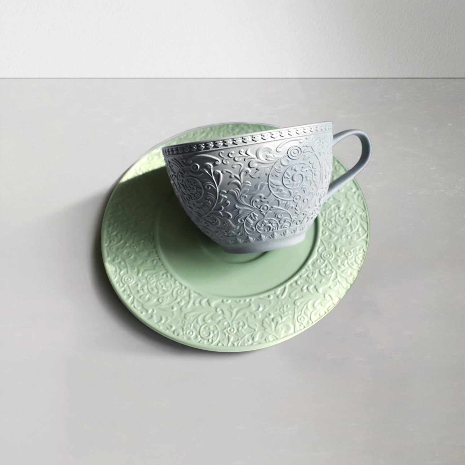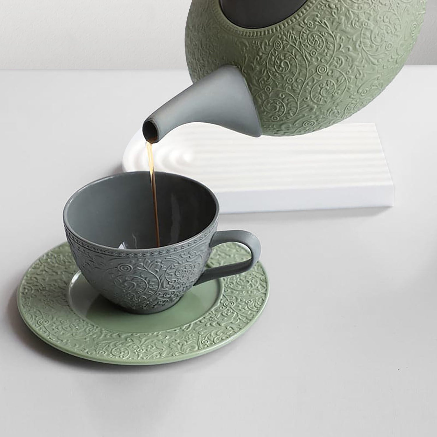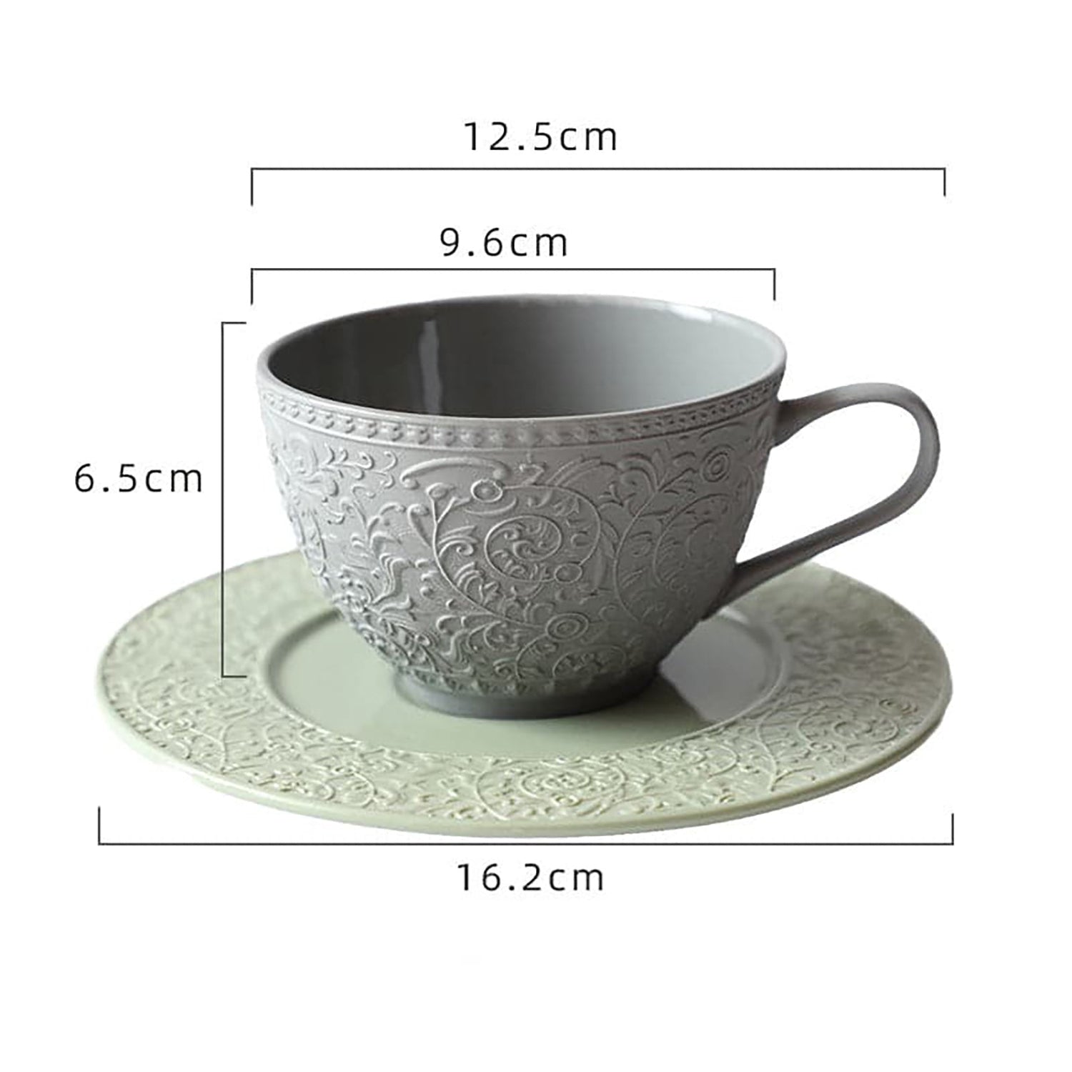 Unique Design: There are exquisite grey green embossed flowers on the cup and saucer, the details are clear and vivid, and the texture is obvious. The exquisite porcelain keeps us in a good mood at all times.