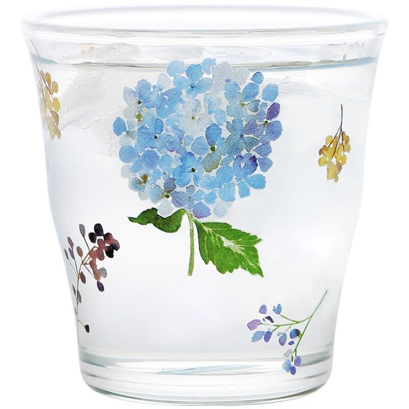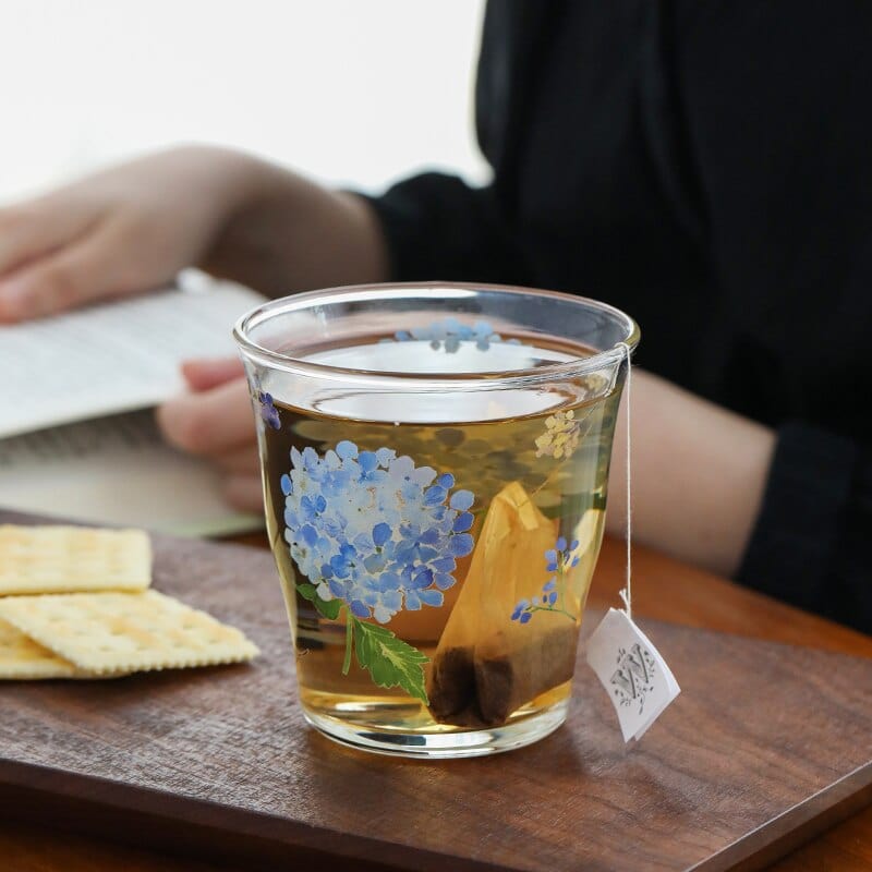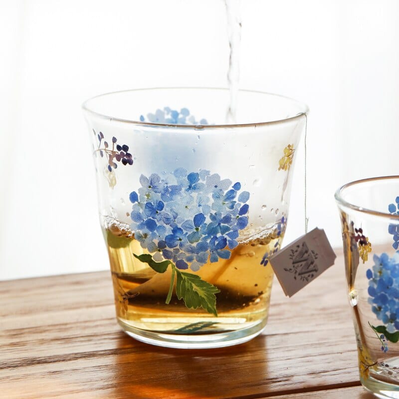 Vibrant blue hydrangeas add to the charms of these glass cups, offered in two size options. Time to meet your tea drinking needs. These Hydrangea Glass Cup are perfect for home or office use.