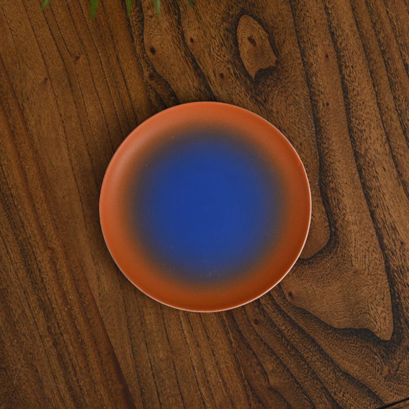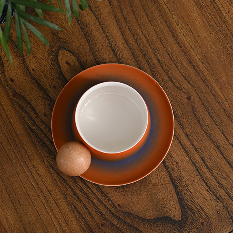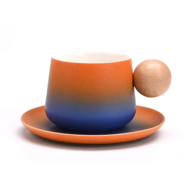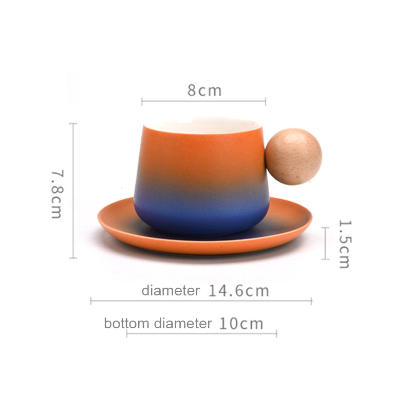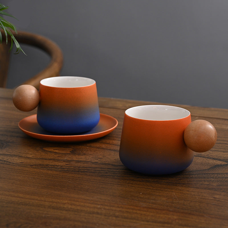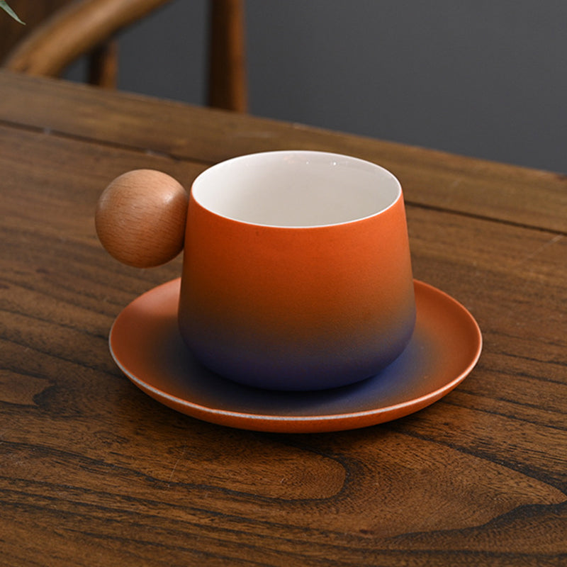 The antique mug with fine porcelain and a wooden handle. gradient orange with a blue ramp with matte texture, elegant with ergonomic Japanese design, easy to handle, made of rough pottery, anti-slip, and anti-scald.