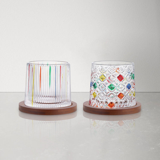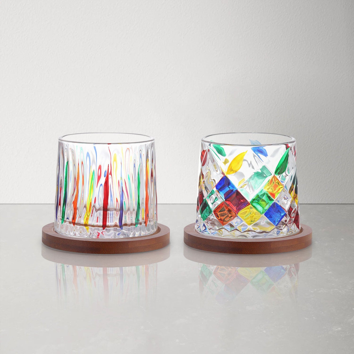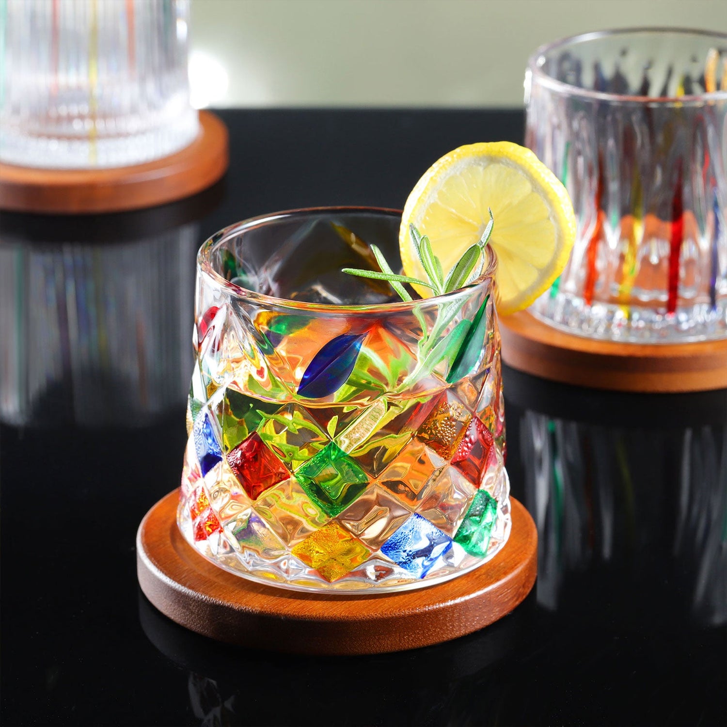 -- Design: This kind of whisky glasses is elegant and special because of its hand-painted crafts. The design of rocking base makes it rotatable on any place without spilling out, also comes with a stable wooden base.