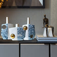 These vases embrace a stunning design. The beautiful swirls of blue against a backdrop of white highlights the beauty of this color combination. The designs are highlighted with gold spheres or holes that make a dramatic look in any space. This alluring accent piece will surely give any space a dramatic look. These vases embody artistic design while creating a striking design that will make any space feel special. Group these vases together for a beautiful display.