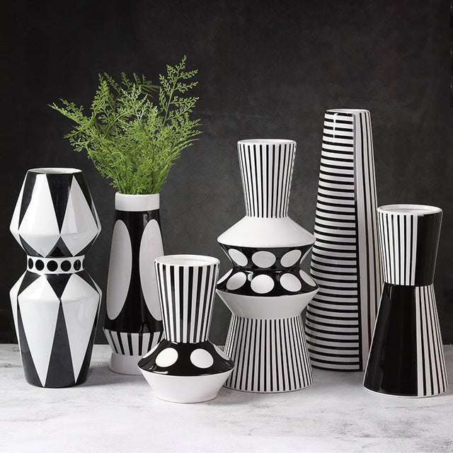 High-quality black and white abstract vase with high-quality ceramic and painted combined by stripes and circles, showing a delicate and soft texture, rich glaze color, high-temperature firing, no fading, no water absorption, easy to clean and harmless to the human body. Bottom details with an anti-wear pad at the bottom to reduce friction with the tabletop. Fit in any modern home decor shining and unique.