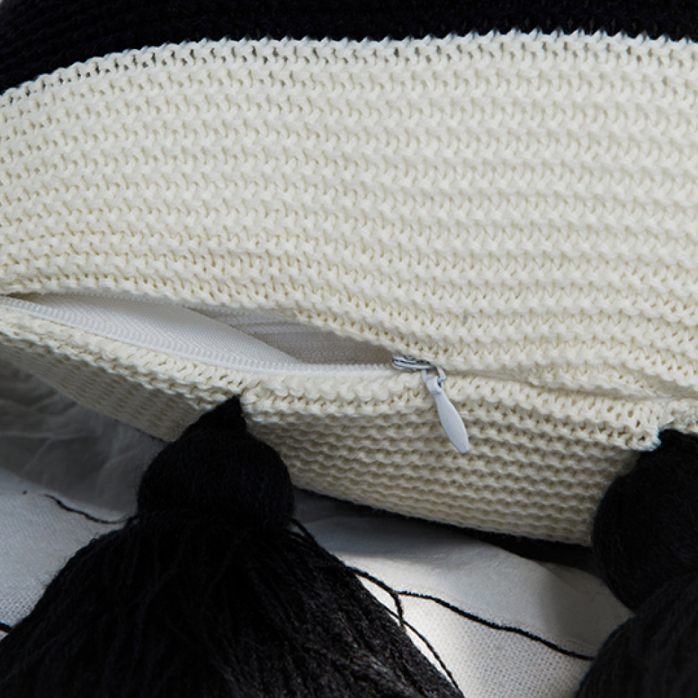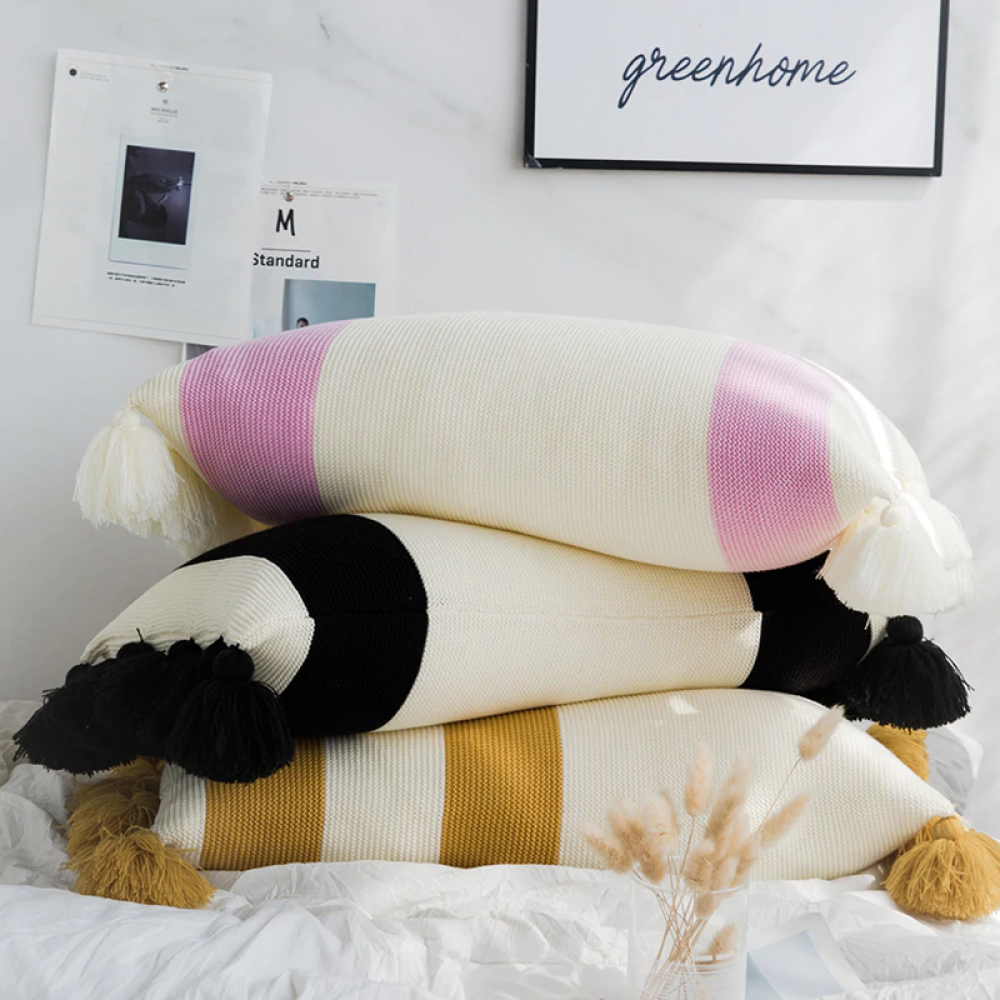 Enjoy the comfort of this knit pillow cover with its large fluffy tassels. The bold stripes add a modern look to this pillow cover. The pillow cover comes in two sizes and two colors. Pay special attention to stripes in the smaller pillow cover and notice the pattern of two bold stripes on the one side or a bold stripe on each side. Mix and match the pillows for a modern look.