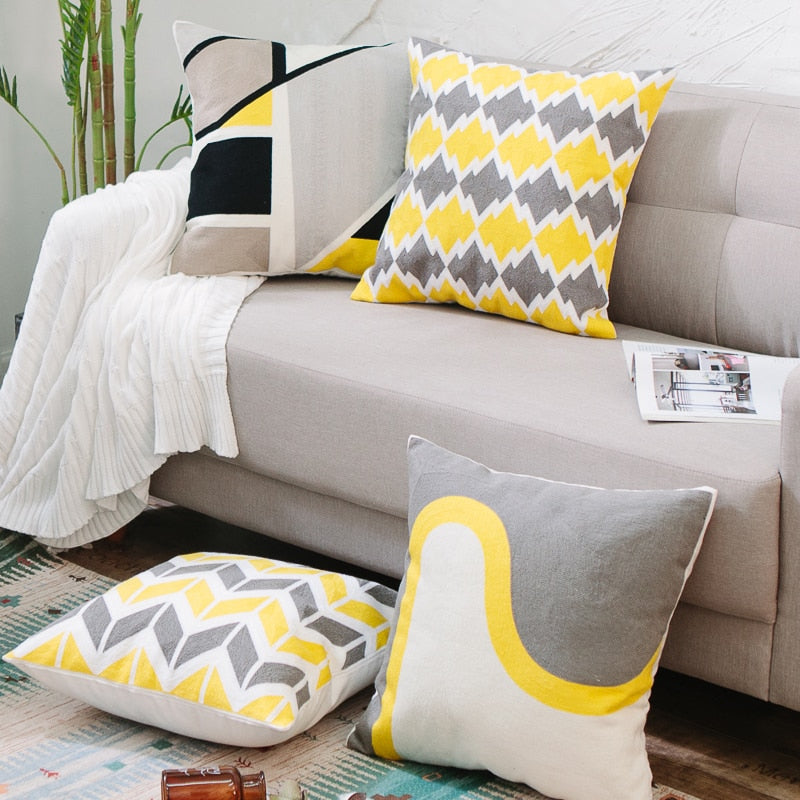 Embrace the calmness of yellow and gray. These pillow covers take this color combination to new design level. These embroidered woven cotton pillows come in various styles to allow you make your own design statement. Use one or group together to create a modern look.