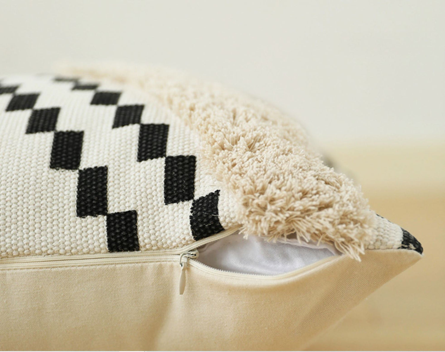 X marks the spot with this black and white hand embroidered pillow cover. The pillow cover has a checkered design with a bold textured X on the pillow cover.  The textured X enhances the design of the pillow and makes the design even more interesting. The back side of the pillow is solid white. Use one or a group of black or white pillows to make a bold statement. Check out the Matador pillow ffrom this collection for inspiration.