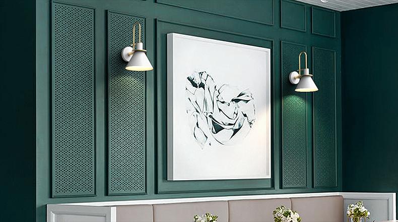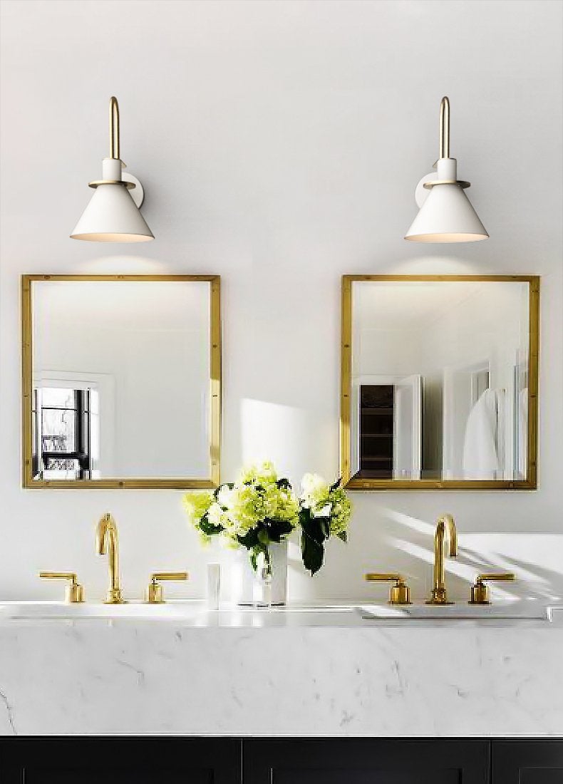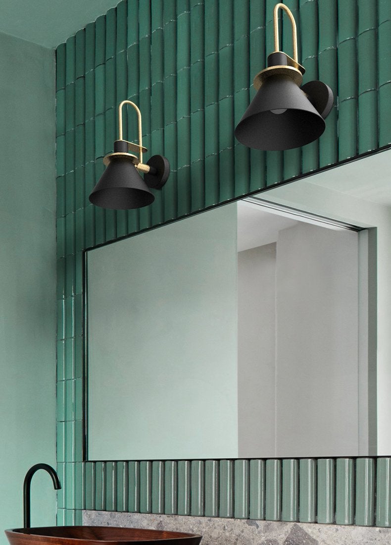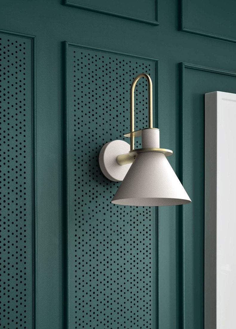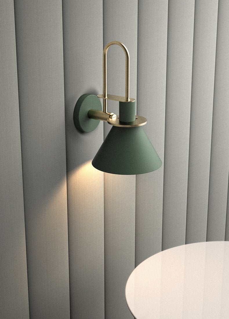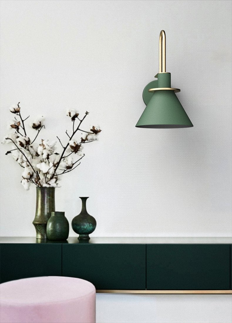 Modern minimalist design wall sconce light featuring brass coloured detailing. With black, white, or green conical shaped lamp shade.
