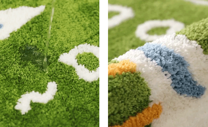 The bath mat is made of heavy-density yarn. Thick and fluffy contact surface offers exceptional comfortable feels to help soothe tired feet, and is super absorbent that helps save your floors from dripping water while you were stepping out of the bath, shower, or getting ready by the sink.