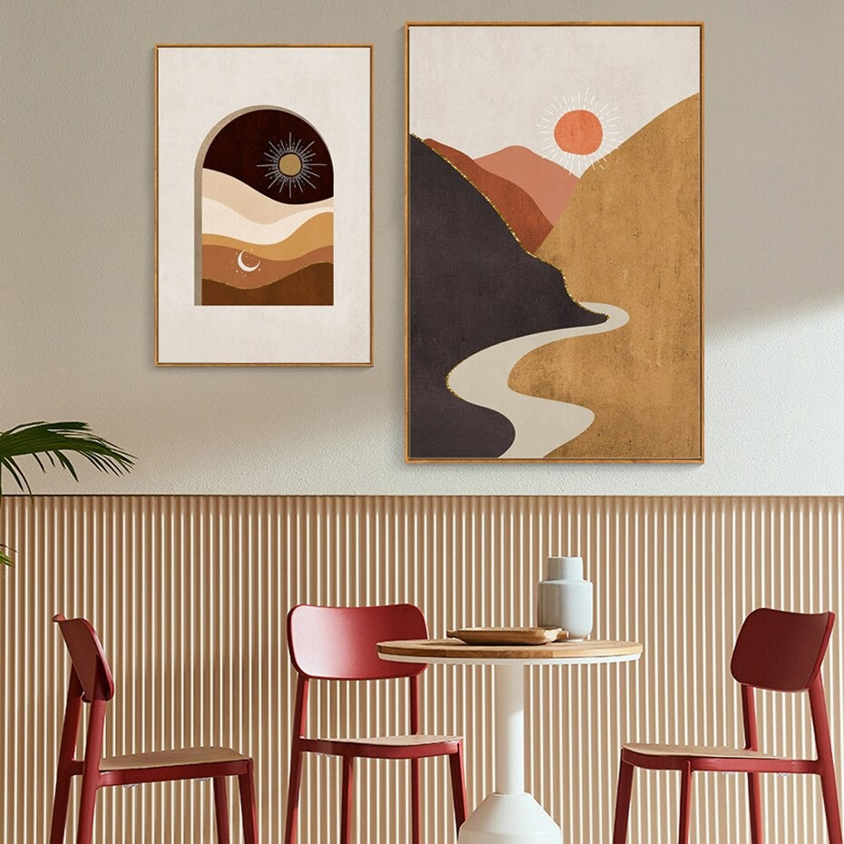 Embrace the tranquility of an abstract mountain landscape. Style any space with these modern minimalist art prints. The colors of this collection will give any space a boho feel. Mix and match your favorite art prints on a gallery wall showcasing everything that makes your style unique. These prints come in various sizes so you can create your own gallery wall showcasing your creativity while giving any space a boho feel.