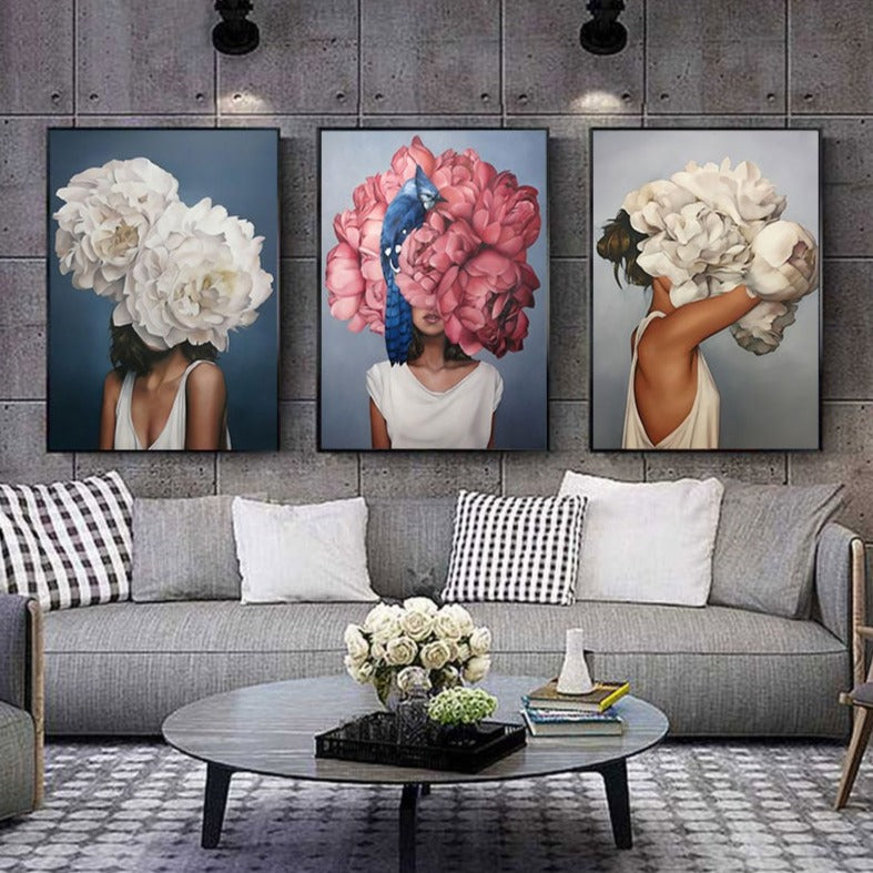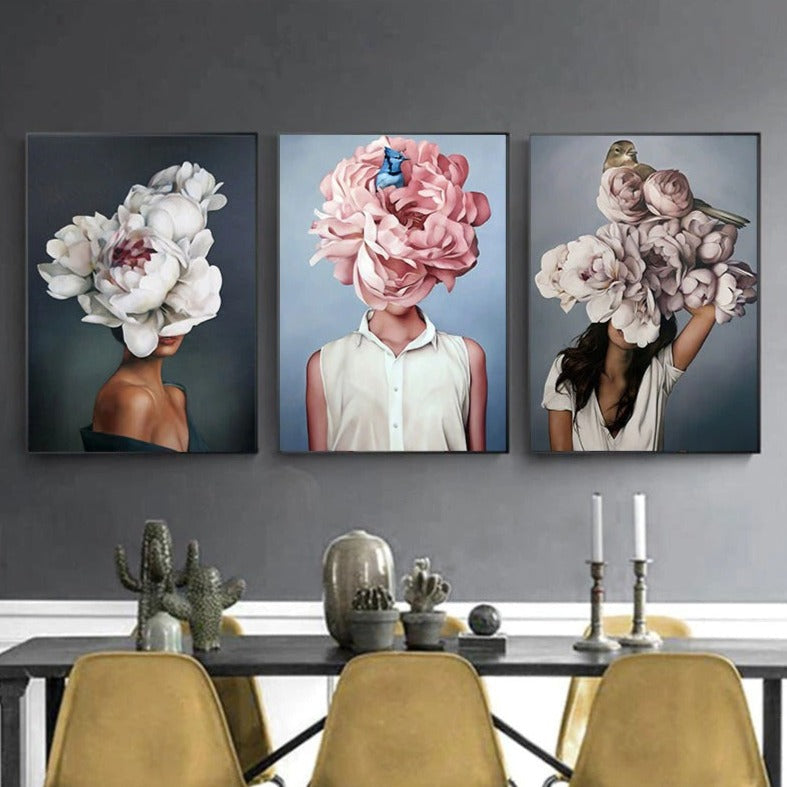The beauty of the flower meets the power of the feminine force. Each print is unique with the beautiful detail of flowers printed in vivid color. These canvas prints will give any space a dramatic and modern look with a dose of romance. Group them together to create an art gallery feel in any space.