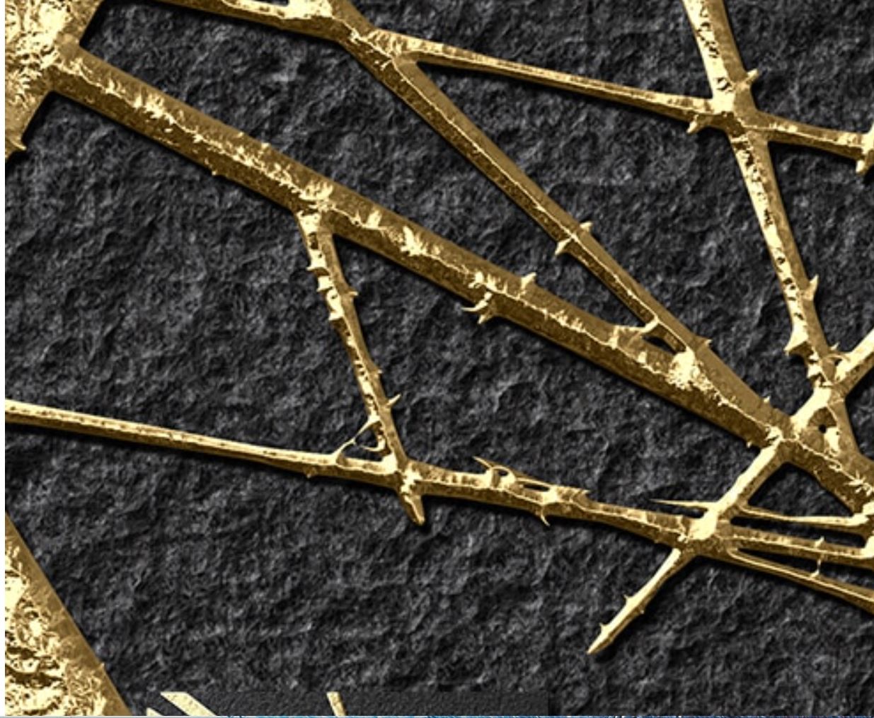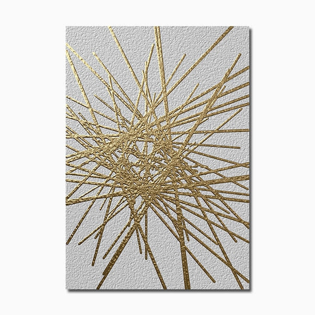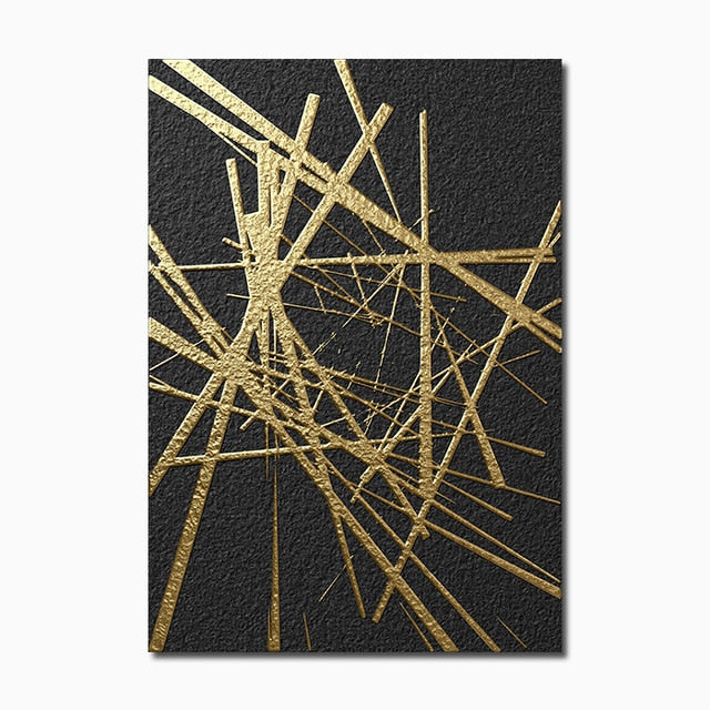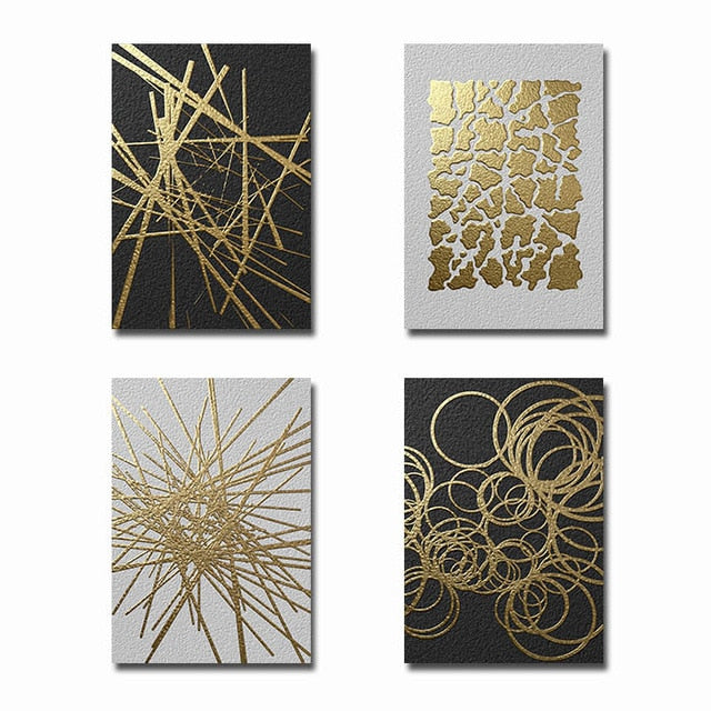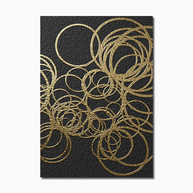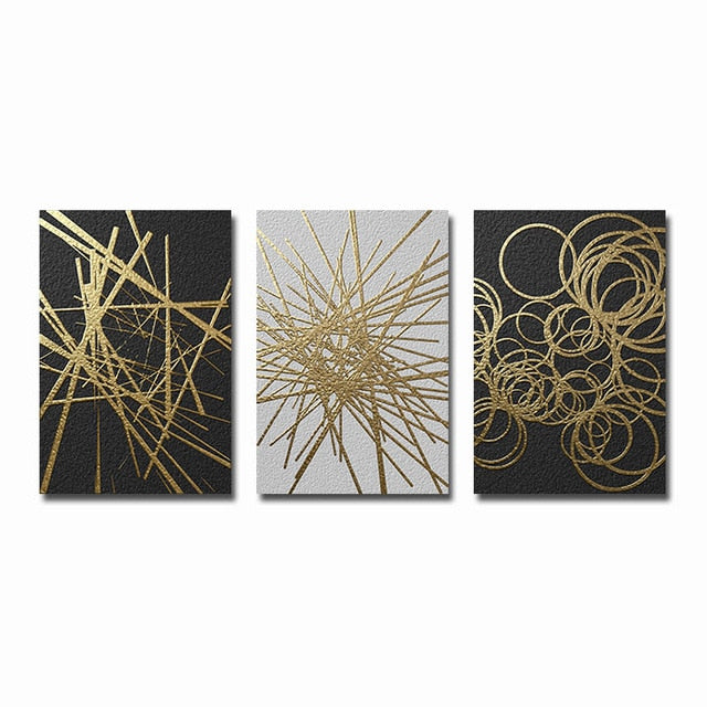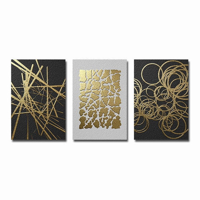 Embrace the boldness of black and gold on these textured canvas prints. The bold designs includes matte golden twigs scattered on a black textured background and an endless circle design. The third print embraces the simplicity of matte gold on white. The matte gold color gives these prints a sophisticated look. Group them together to make a bold artistic statement in any space.