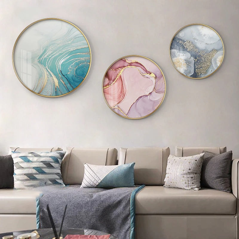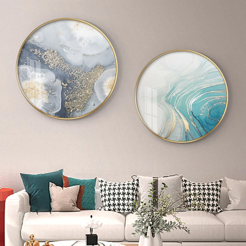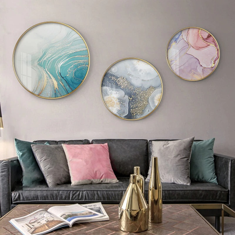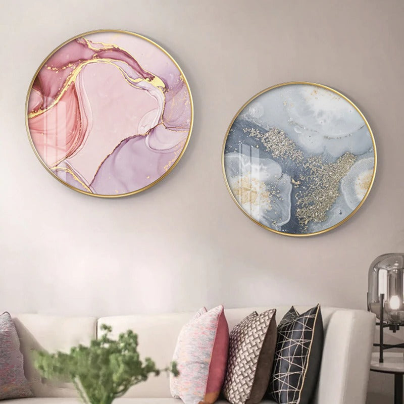 Warm colors swirl in this marble pattern giving any space a feeling of tranquility. These circular canvas prints look good in any space. The circular shape adds an artistic element that makes these prints really stand out. Group them together in different sizes and styles to create your own personal art gallery. Enjoy and embrace the modern beauty of the cosmos with these circular prints. Don't forget to check out the Rollo Circular Frames to complete the look. Frames are shipped separately.