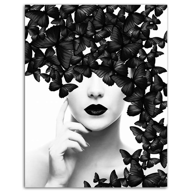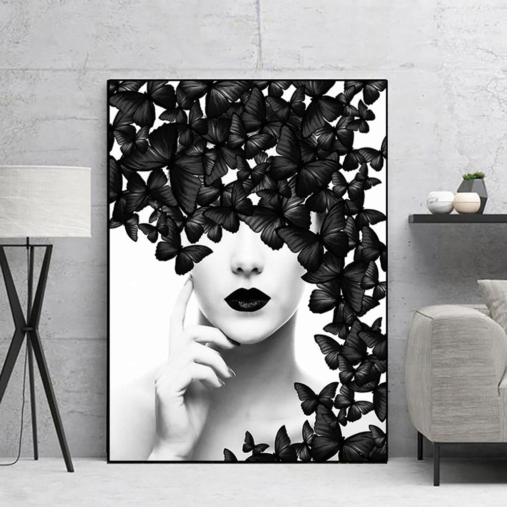 A woman's beautiful face is surrounded by the flutter of bold black butterflies. The bold color of black combined with the the white background gives this woman a dramatic look as the butterflies flutter around.