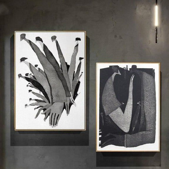 Embrace the colors of black, white and splashes of gray in these modern abstract unframed canvas prints. Each one makes a bold statement. Look closely and you will see the detail of these images that are abstract in appearance but have interesting details. The combination of the boldness of black and white with the artistic detail in watercolor gives these prints artistic depth. This makes them the center of attention in any space. The canvas prints look great alone or paired together.
