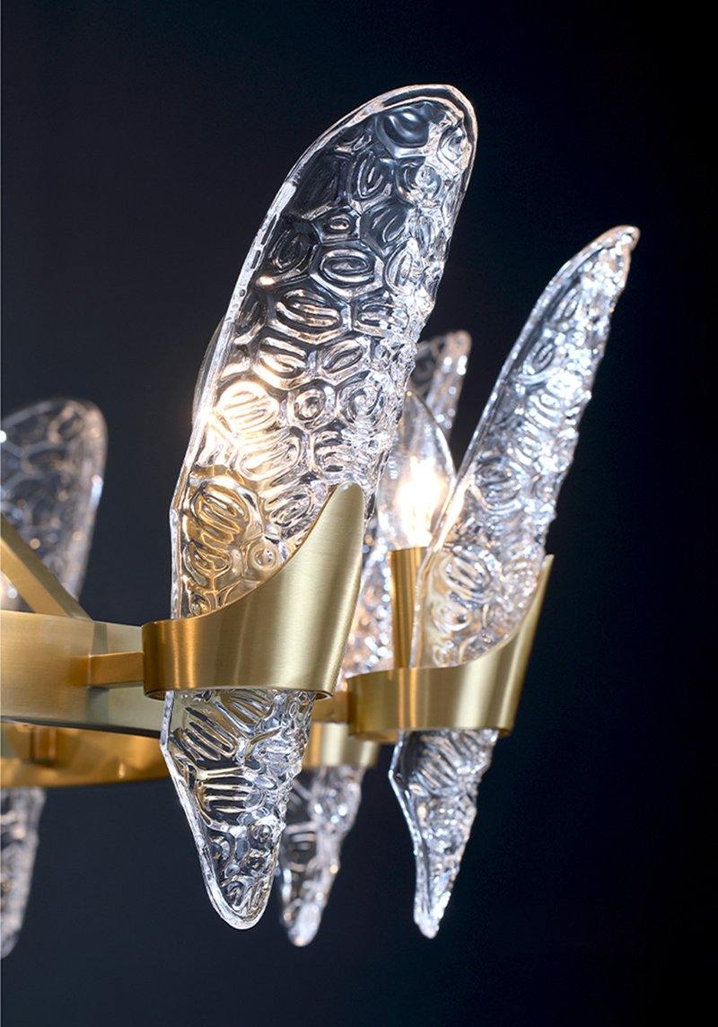 The chandelier is in contrast with the rich warmth of the transparent crystal glass to give a sense of design. This classic streamlined swivel feature has softly curved steel support bars, each supporting a glass shade with its own light source. Use with the E14 bulb to get the most out of vintage effects.