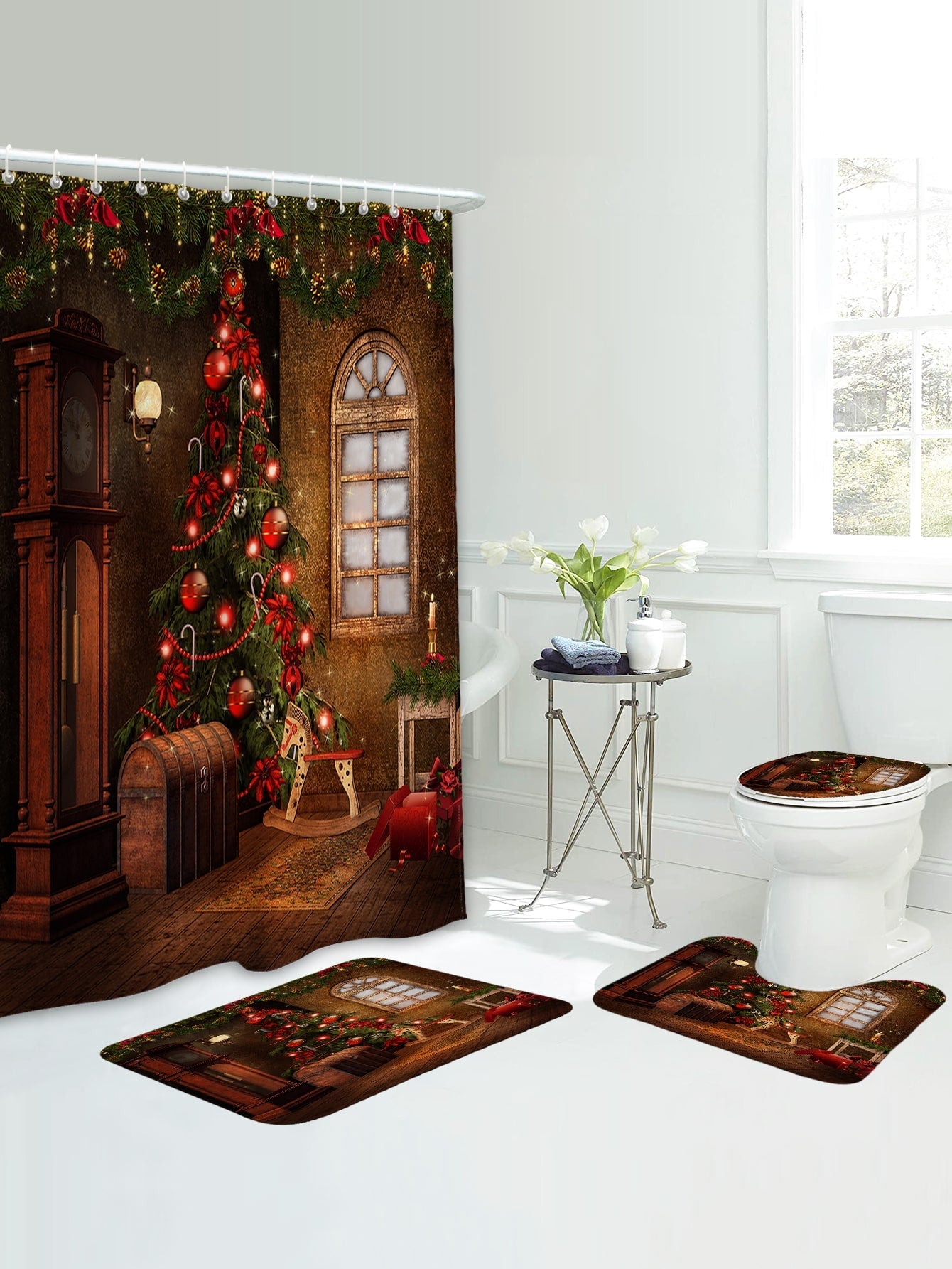 4pc Christmas Tree Pattern Shower Curtain And Bath Rug
