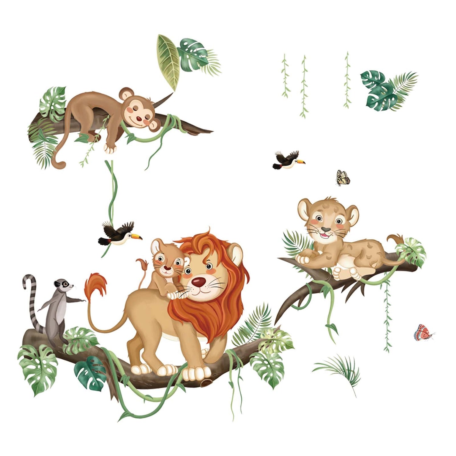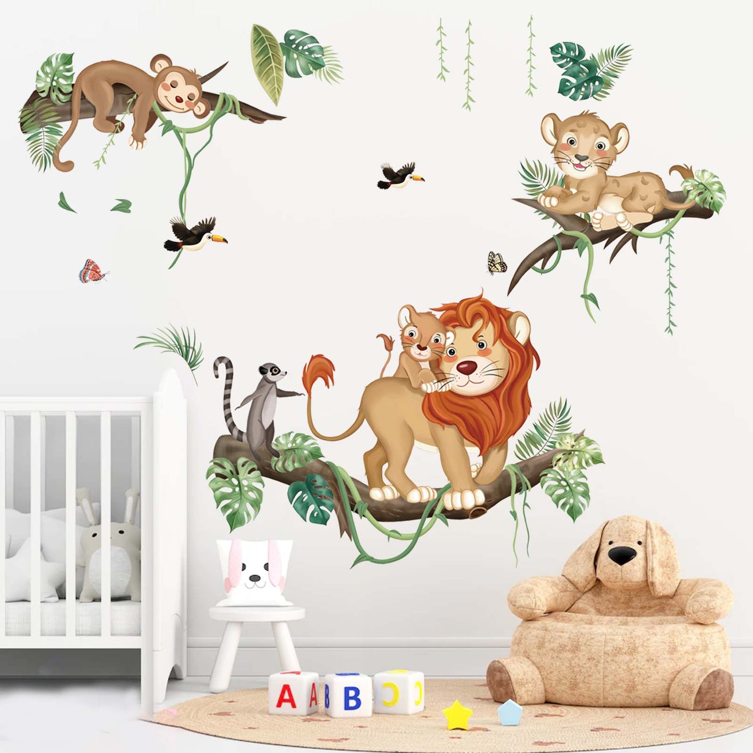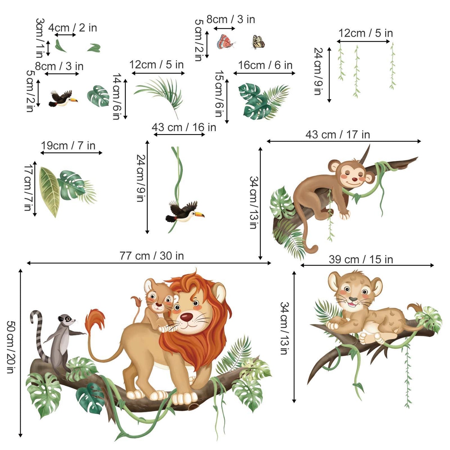 This decal is a great decoration for kids room, including lions, monkey, trees branch, birds and leaves. It creates a rich forest atmosphere for your room.