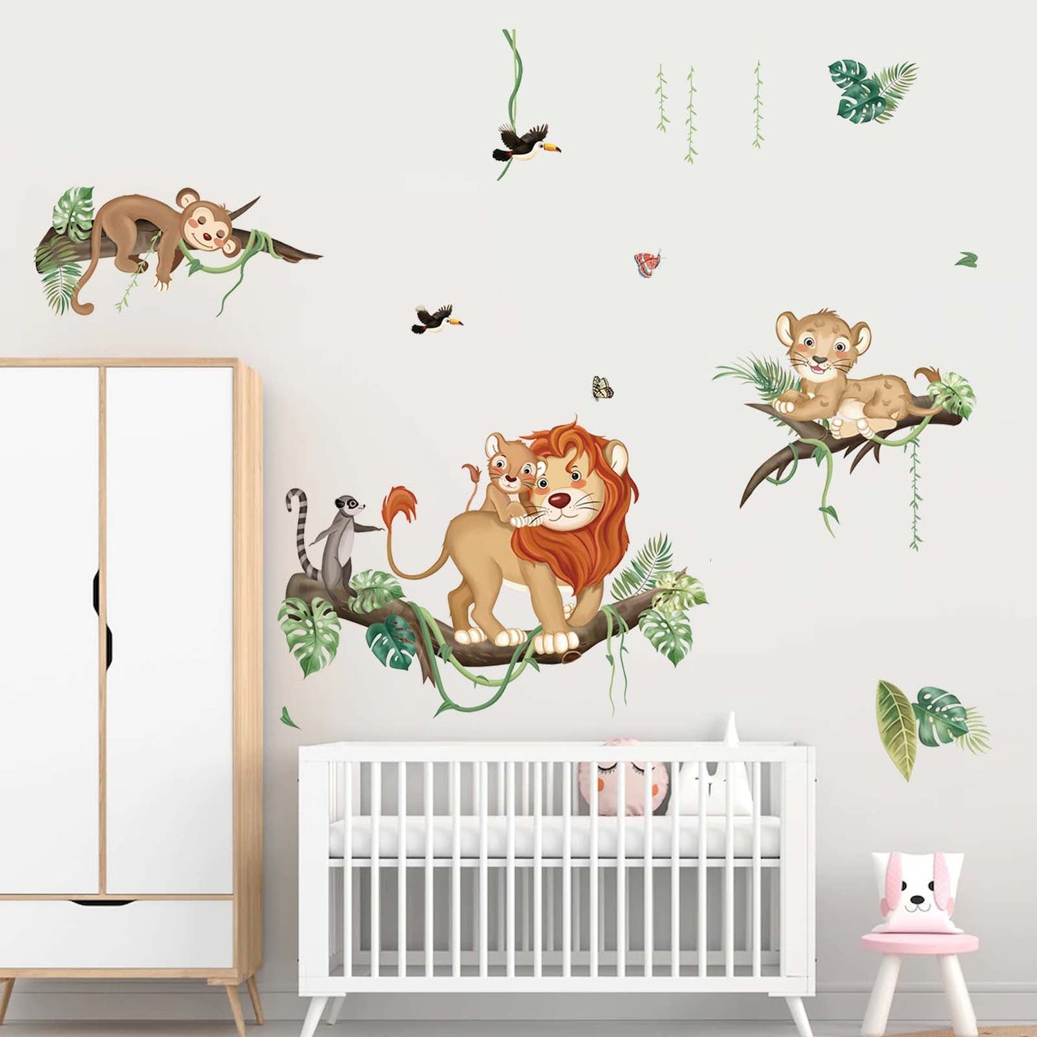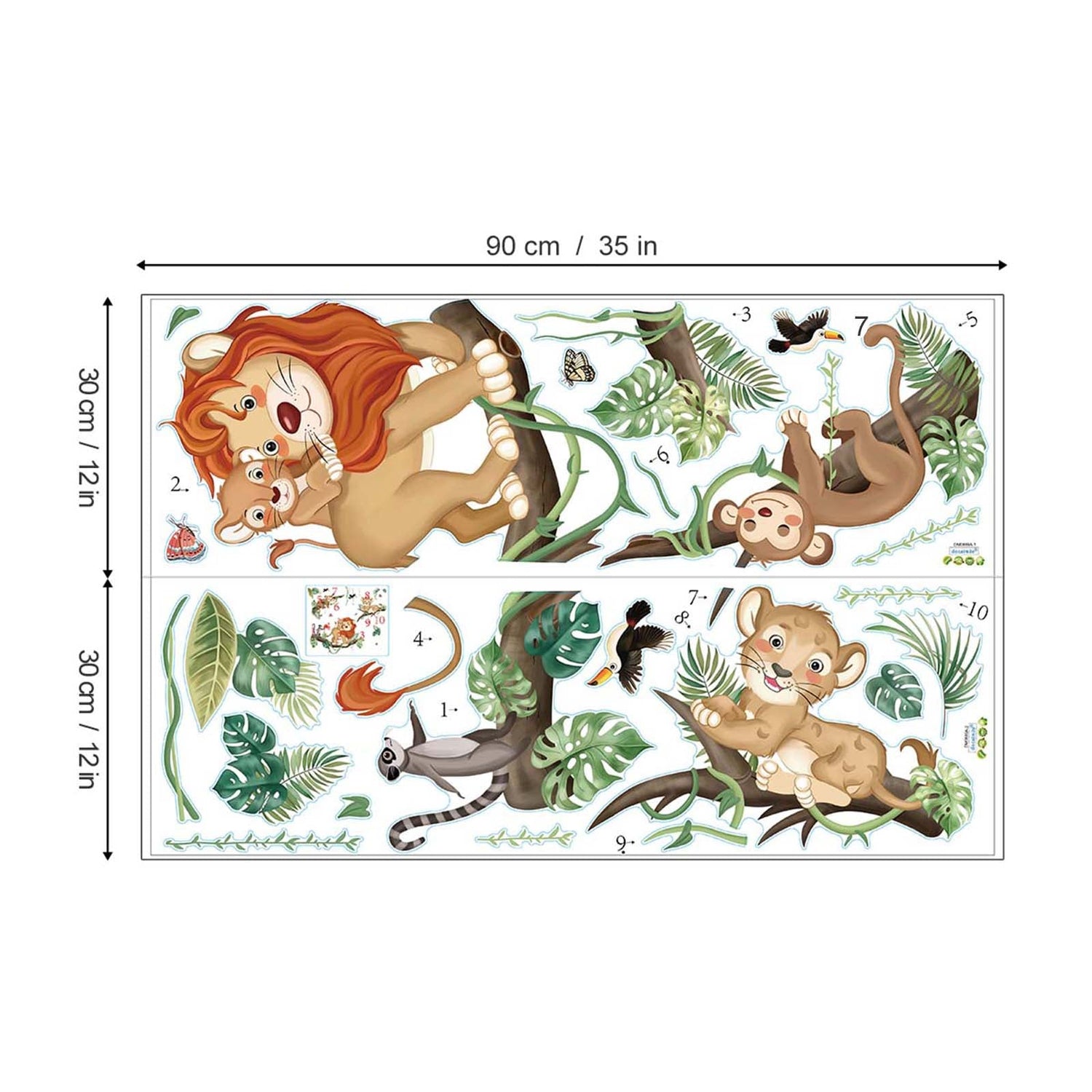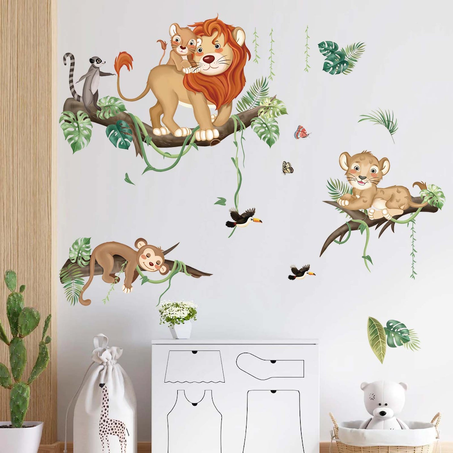 This decal is a great decoration for kids room, including lions, monkey, trees branch, birds and leaves. It creates a rich forest atmosphere for your room.