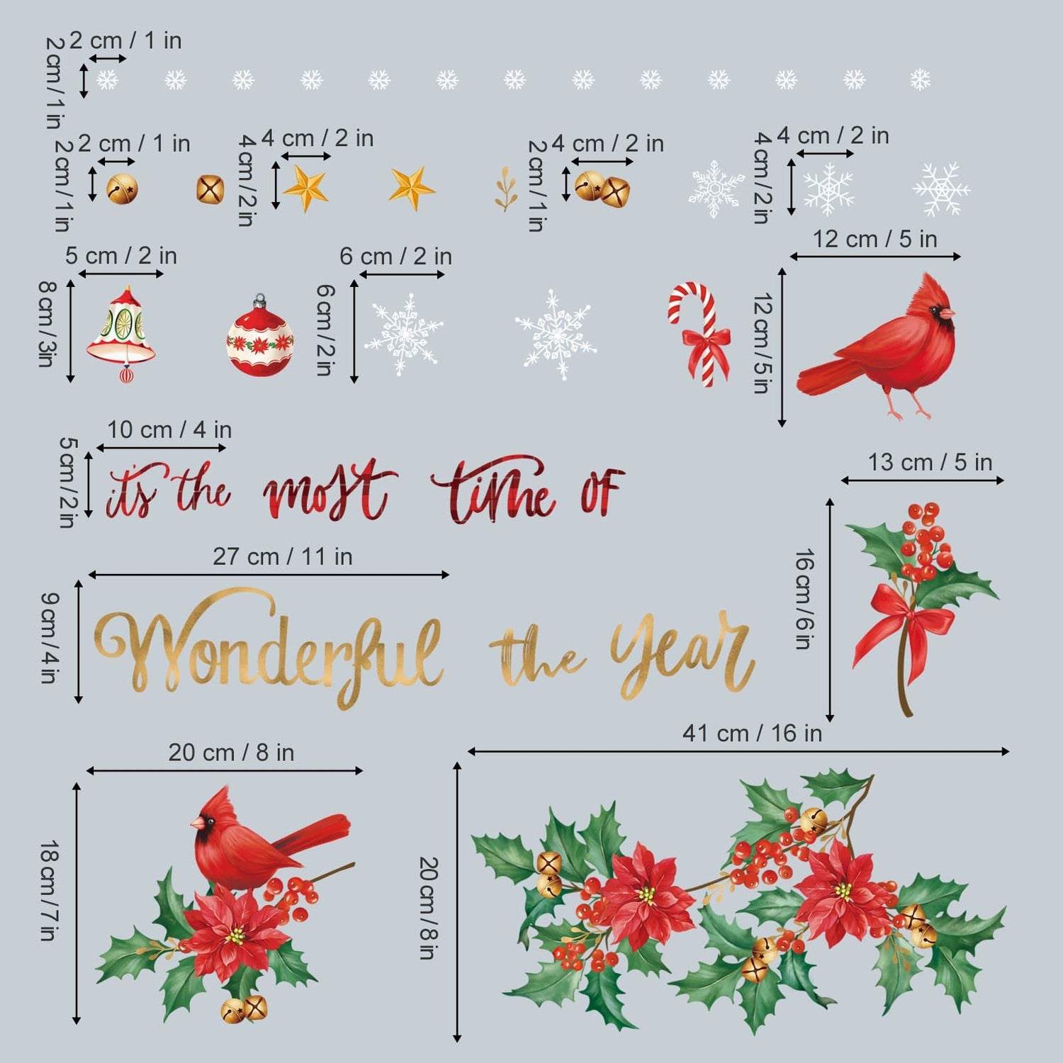1. This decal included Cardinal bird, poinsettia flower branch, some snowflakes, and the phrase "its the most Wonderful time OF the year", are beautifully designed with a stylish warm cartoon effect