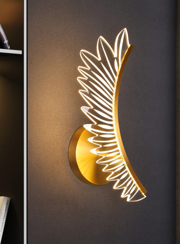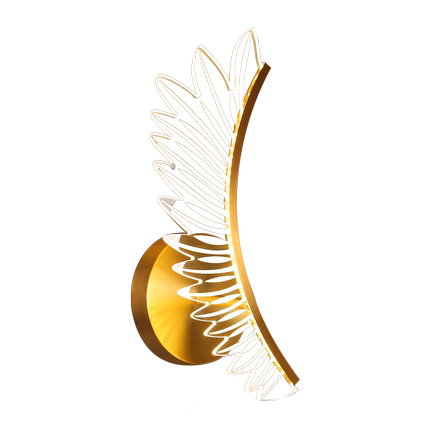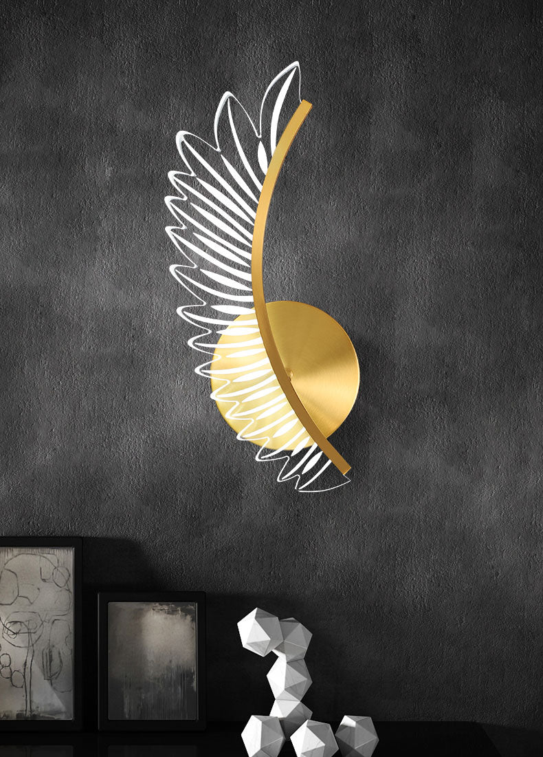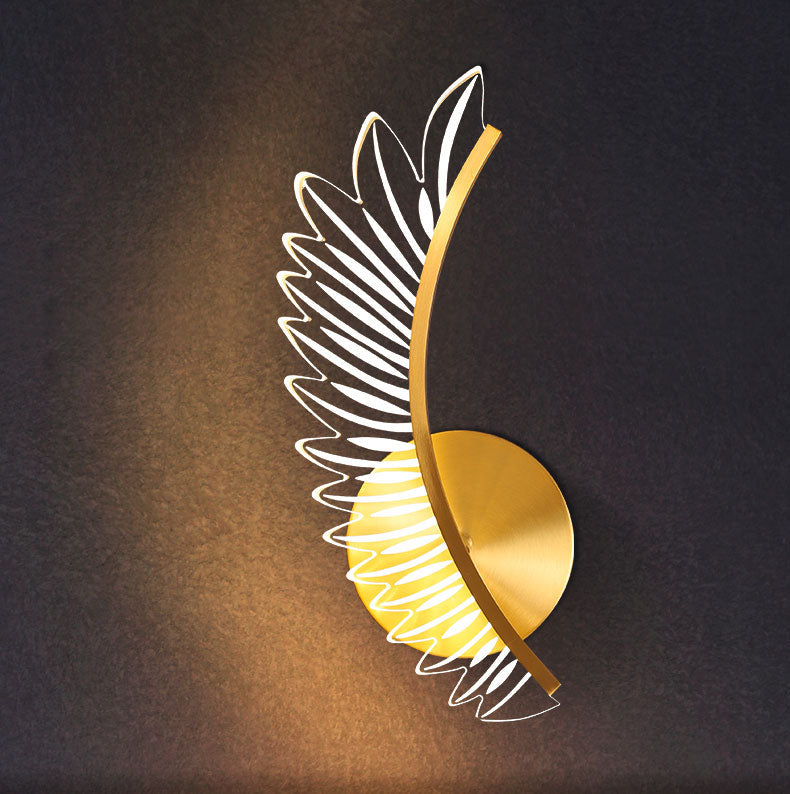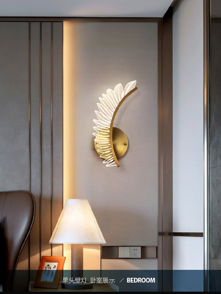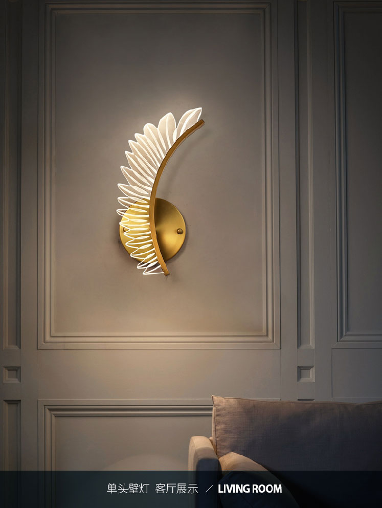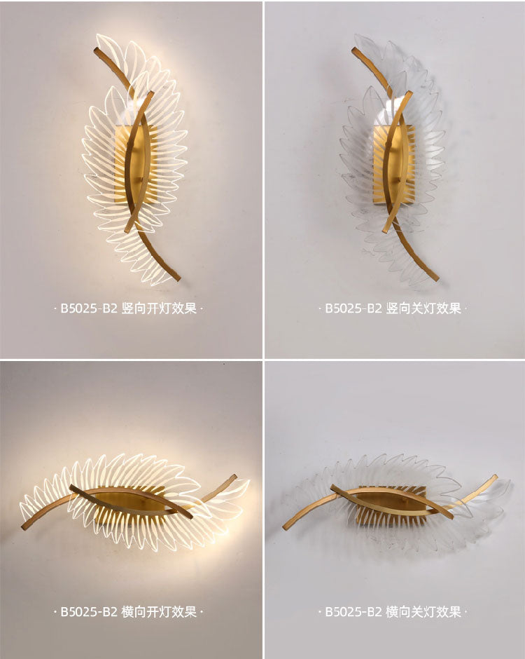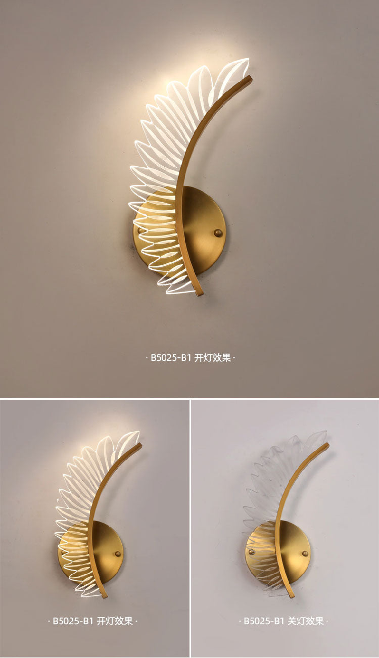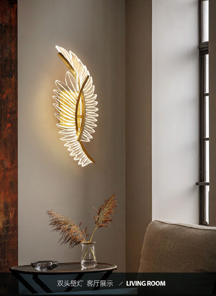 Feather LED Wall lamp is made from solid brass and acrylics. It is equipped with warm white led lights or tri-color dimmable led sources. Acrylic light leaf Creative light leaf shape Acrylic light guide plate.Light effect is soft and warm, avoiding direct glare from the light source, more effective eye protection, uniform light emission, high brightness