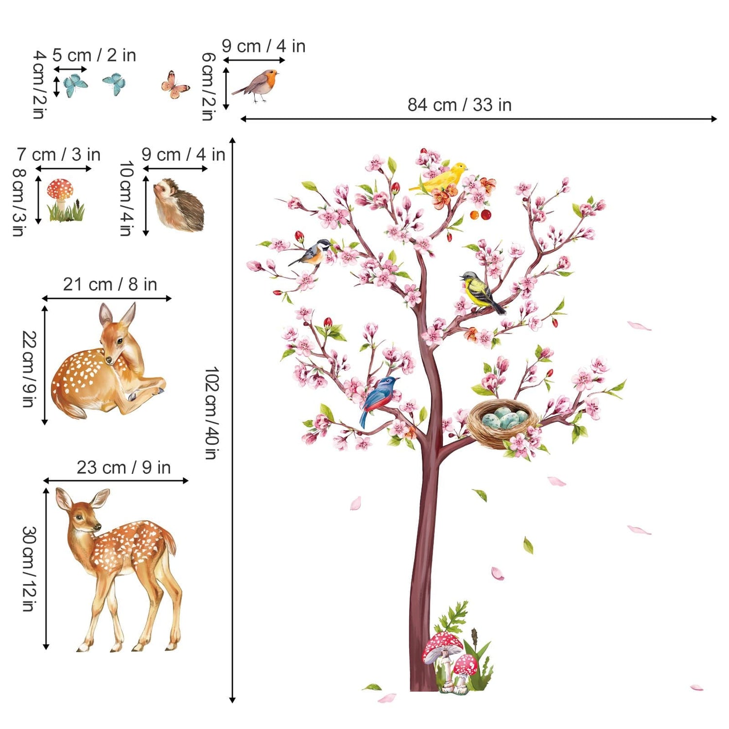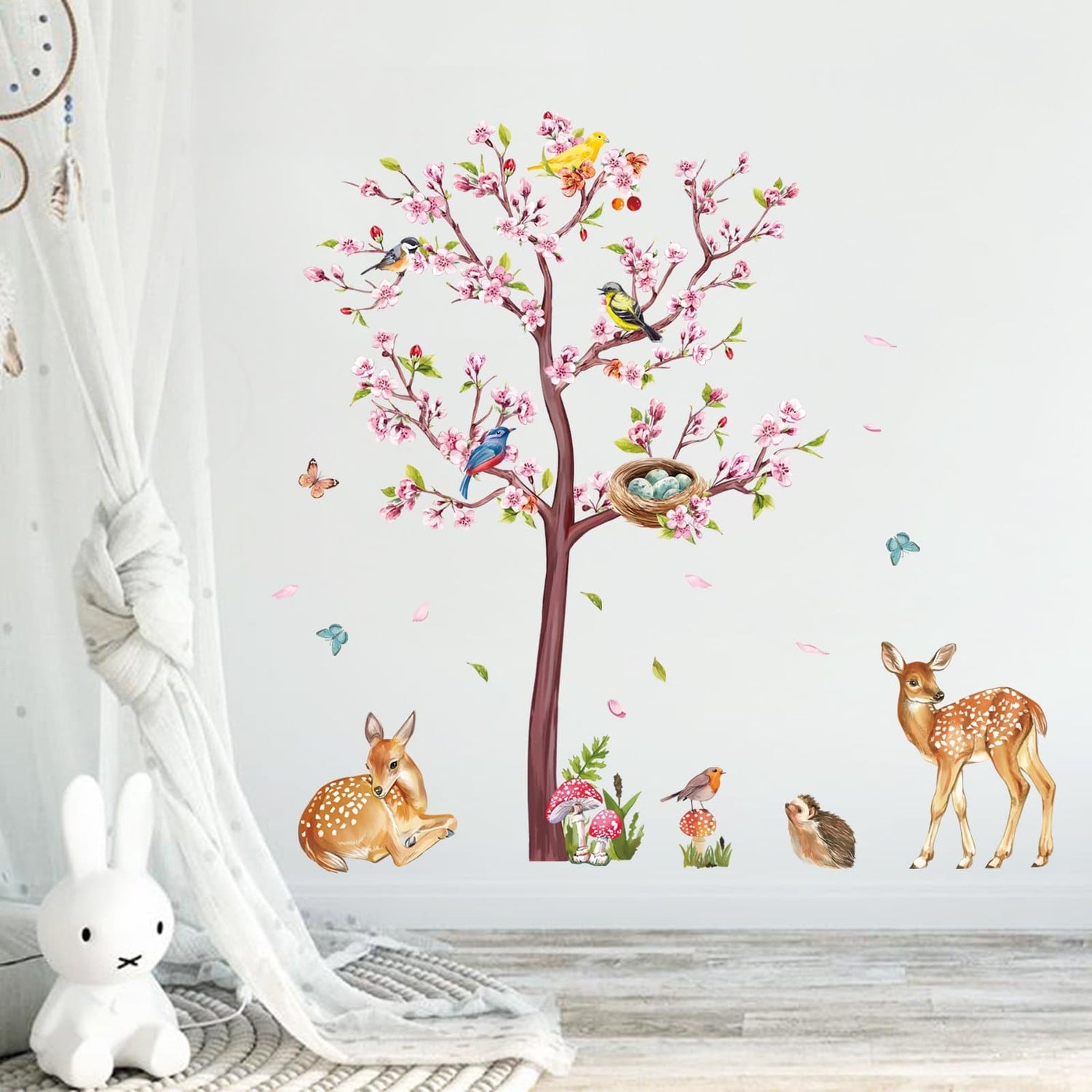1. This decal included a tree full of pink flowers, some birds on the branches, butterflies, and deer, which are beautifully designed with a stylish warm cartoon effect