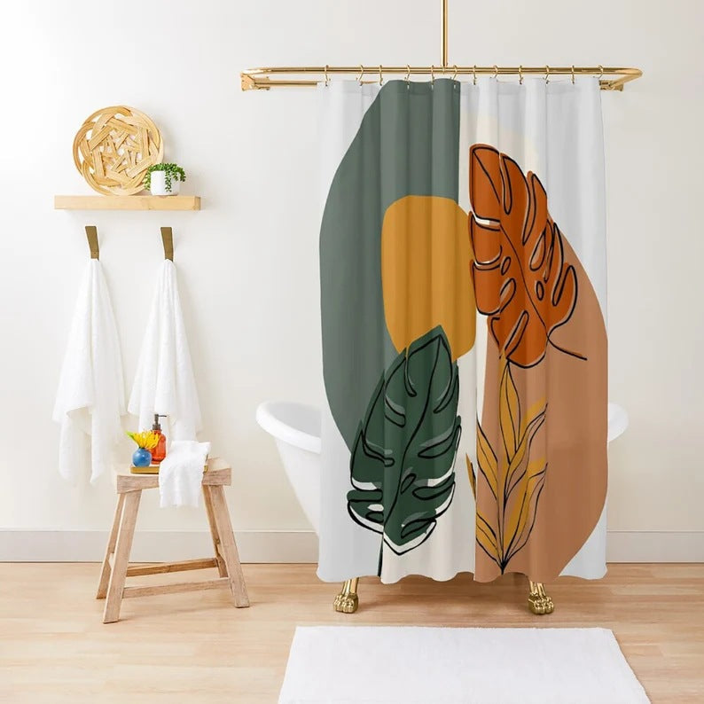Art Leaves and Geometry Blocks Shower Curtain, Floral Waterproof Curtain Decor, Unique Bathroom décor, Boho Shower Curtain, Customized Bathroom Curtains, Extra Long Shower Curtain