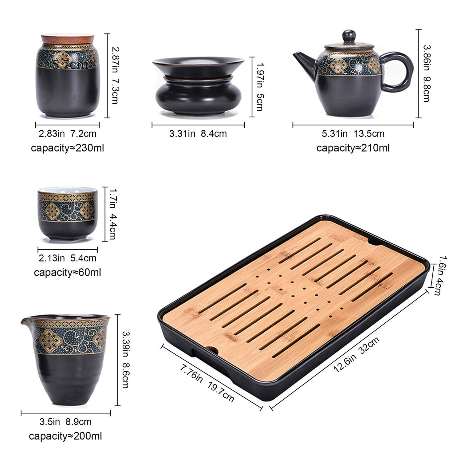 PACKAGE: Comes with carton package, including 1 teapot, 6 tea cups, 1 tea canister, 1 fair cup, 1 filter, 1 tea tray, 1 travel bag. The porcelain tea set is packed with foam and shockproof box to prevent broken in shipping.