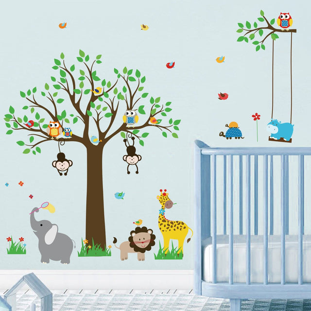 1. This product contains a big tree, monkeys, owls, a elephant, a lion and a giraffe, all elements are carefully designed, suitable for decorating children's rooms