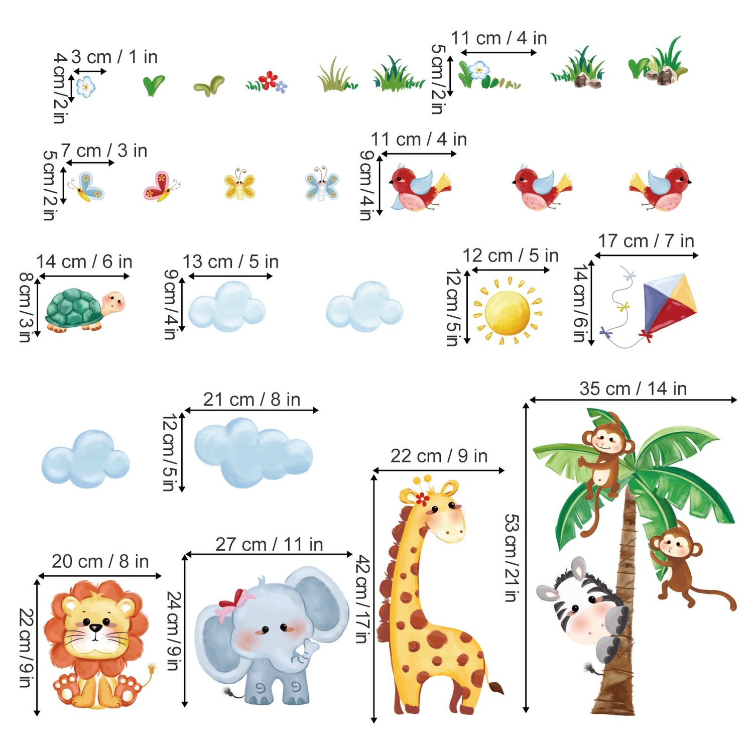 This wall sticker includes a tropical tree, giraffe, elephant, lion, zebra, monkey and other small animals and plants, etc, are beautifully designed, decorate your room with stylish and warm effects.