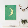 About: La Luna Canvas Wall Art print featuring the moon from the Mexican retro card game, Loteria. A fun, colorful, vintage inspired addition to your home or office. Suitable for a traditional, eclectic, bohemian or modern decor.