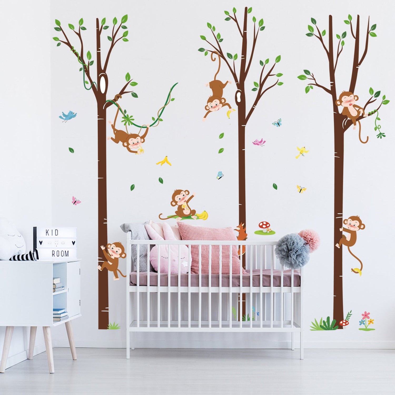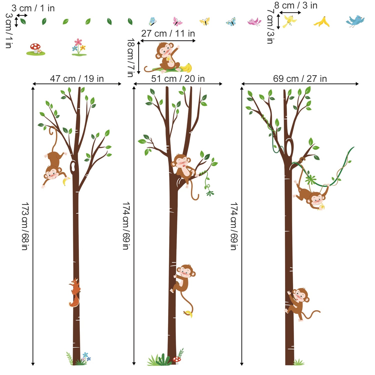 This wall sticker includes large brich tree, monkey with vine, squirrel, birds and other animals, are beautifully designed, decorate your room with stylish and warm effects.