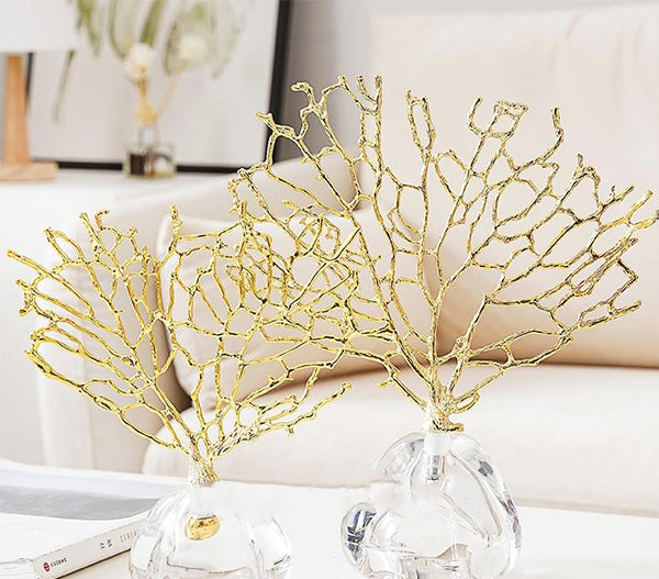 Embrace the beauty of coral in gold. This metal statue has the detail of coral while highlighted with a clear base. The elegance of this coral statue combined with the intricate beauty of coral will give any space a look of sophistication.