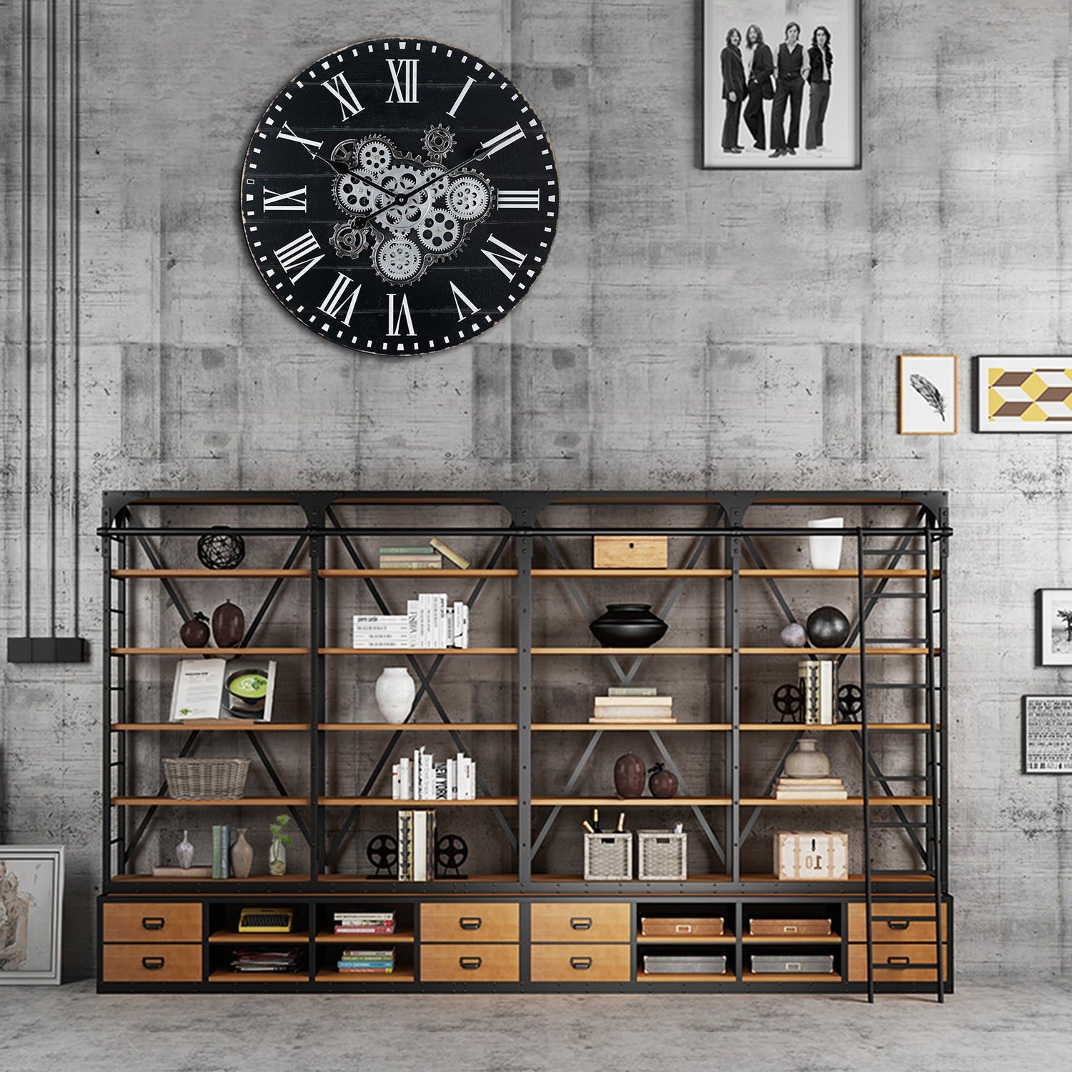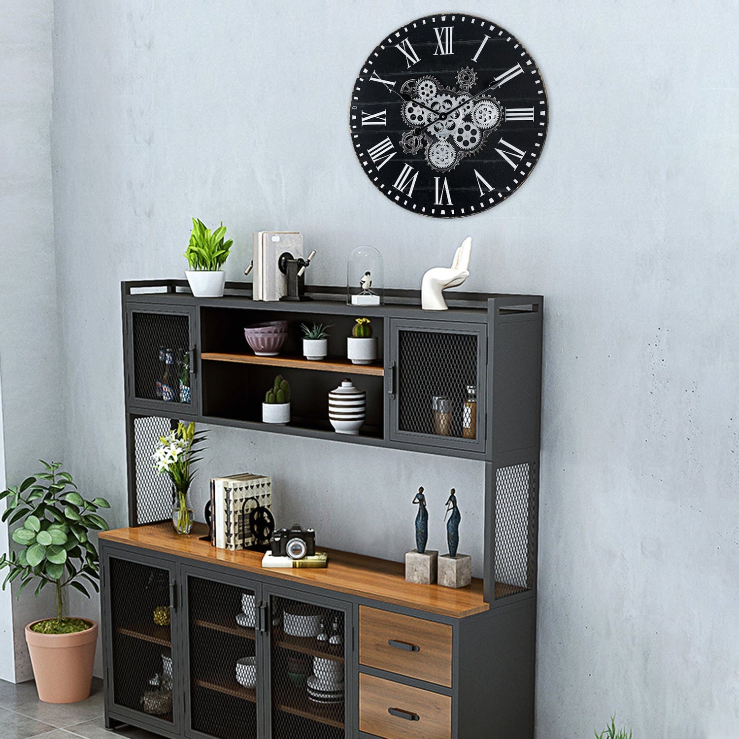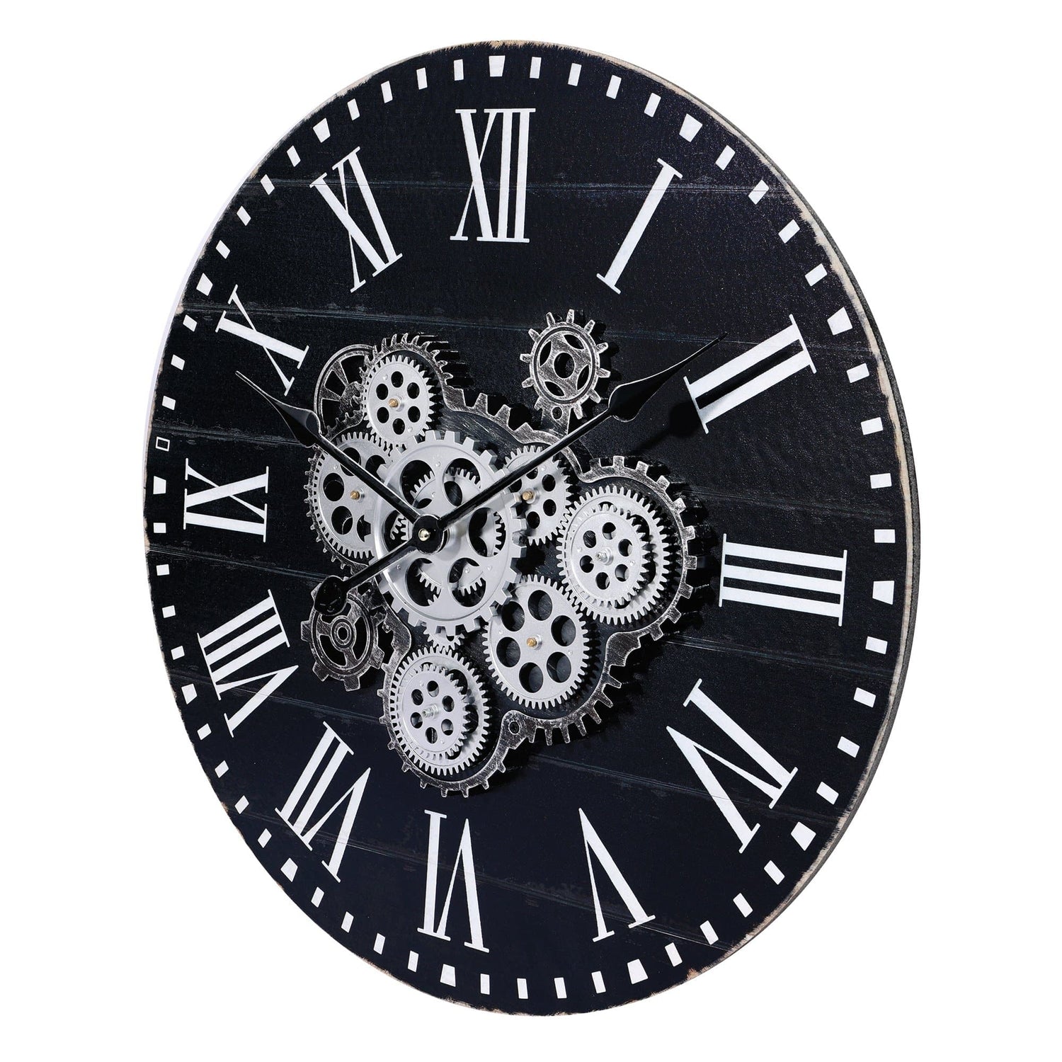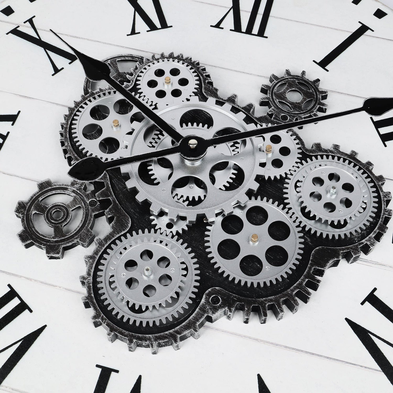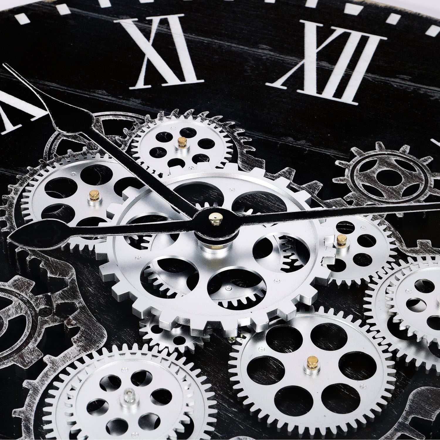Distressed dial, large Roman numerals(Easy to read in the room), clock hands, and exposed gears provide a steampunk appearance.
