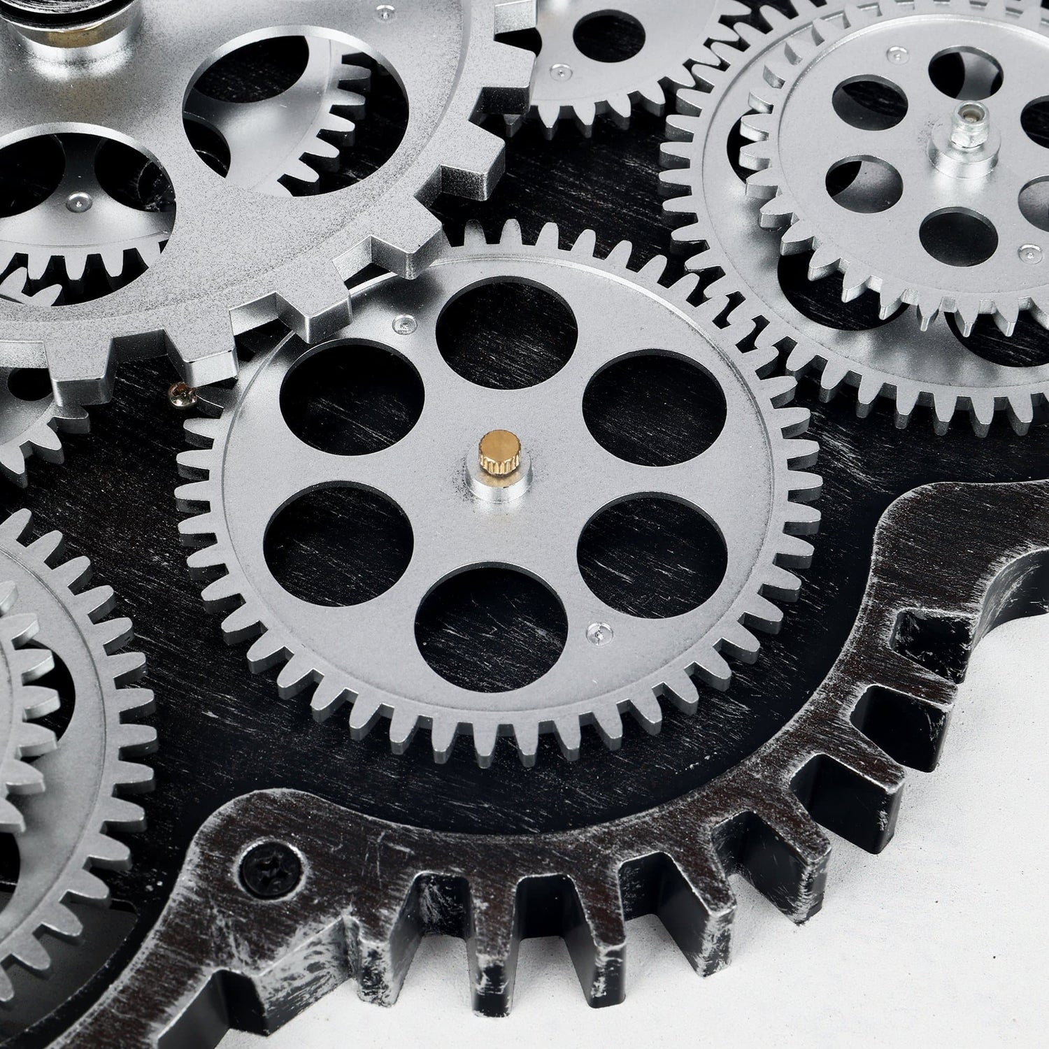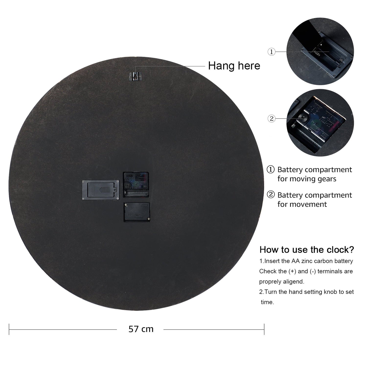 Moving gears have exquisite, stylish, and chic rustic-looking features anywhere. The Movement of the Gear makes the clock become a living element on the wall. So if you prefer to make the 8 cool silver gears move (have a slight sound), you can put 2 AA batteries into the gear battery compartment. Besides, the face is printed so has a look of a lot of texture.