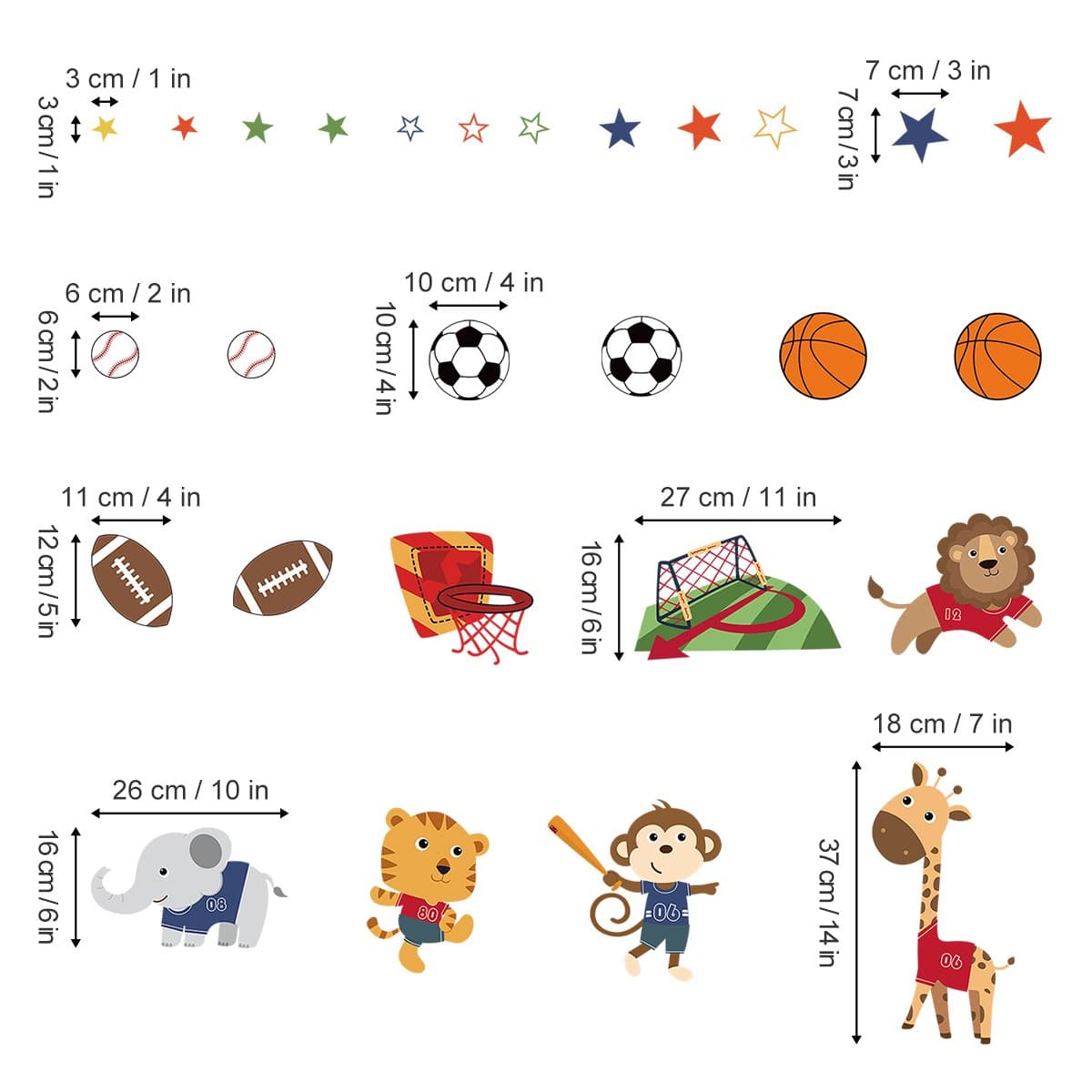 The sports animals wall decals give a vivid picture of animals having fun playing different kinds of sports. Monkey plays baseball, tiger and giraffe play football and rugby, elephant and lion play basketball. Easy to peel and stick and suitable for kids' room, boys' playroom, and children's bedrooms.