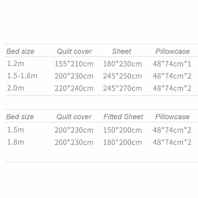 4pcs Set5(Fitted sheet): Quilt cover200x230cm or 79"x91"x1 / Fitted sheet180x200cm or 71"x79"x1 / Pillowcase48x74cm or 19"x29" x2