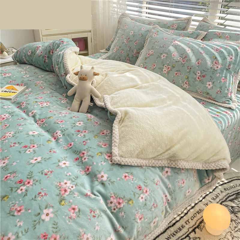Poly Lovely Pink Flowers Green Ground Country Style Milk Cashmere Flannel Berber Fleece Duvet Cover Bedding Set
