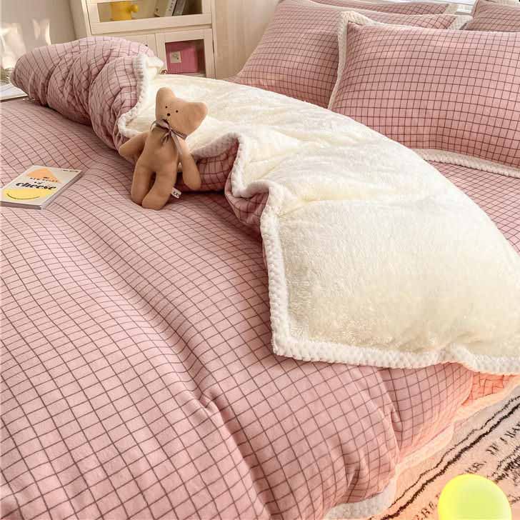Poly Pink Check Cashmere Flannel Berber Fleece Duvet Cover Bedding Set
