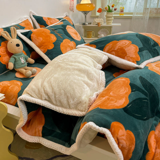 Poly Cute Orange Tulip Milk Cashmere Flannel Berber Fleece Duvet Cover Bedding Set
