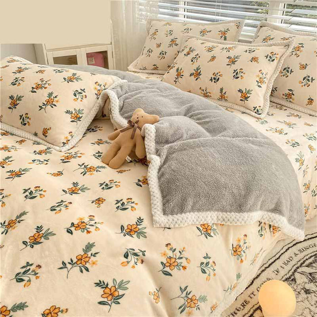 Poly Lovely Orange Flowers Cream Ground Country Style Milk Cashmere Flannel Berber Fleece Duvet Cover Bedding Set