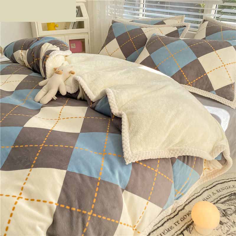 Poly Grey/White/Blue Check Cashmere Flannel Berber Fleece Duvet Cover Bedding Set