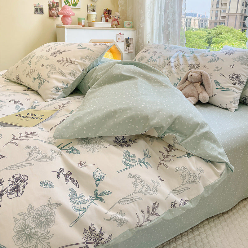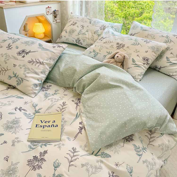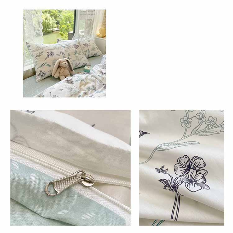 Green Leaves and Flowers Bedding Set Washable 60s Cotton Duvet Cover Bedding Set