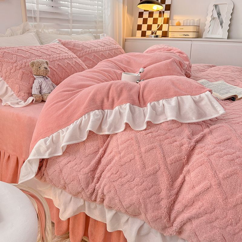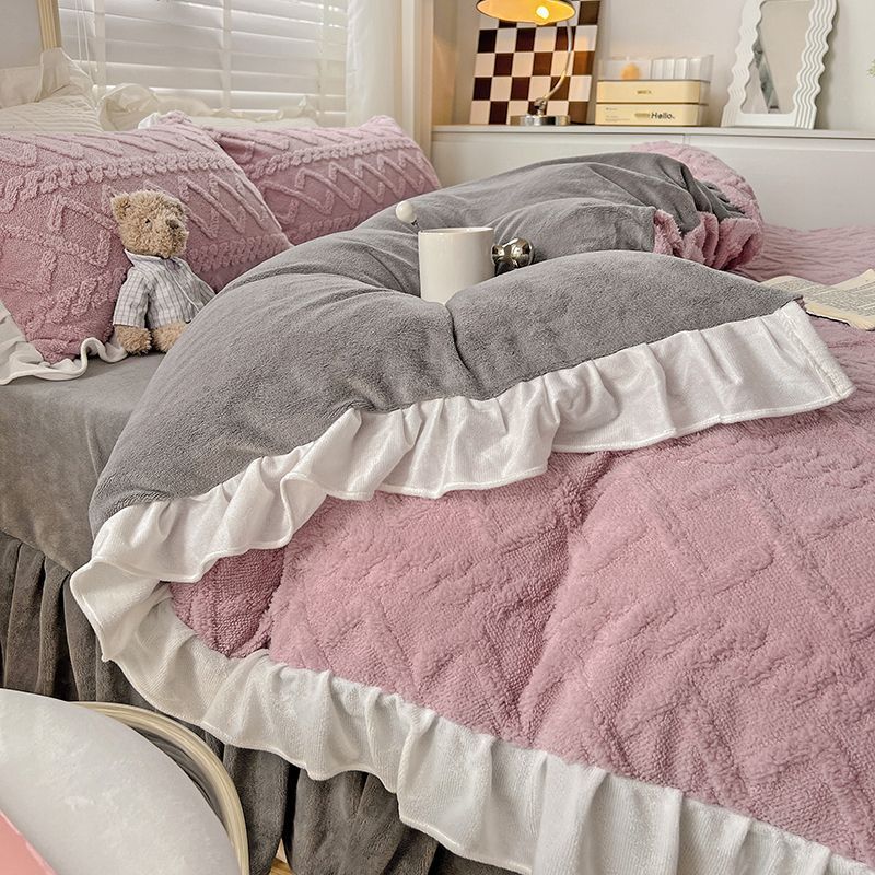 4pcs Set2(bed skirt): Quilt cover200x230cm or 79"x91"x1 / Bed skirt250x250cm or 98"x98"x1 / Pillowcase48x74cm or 19"x29" x2