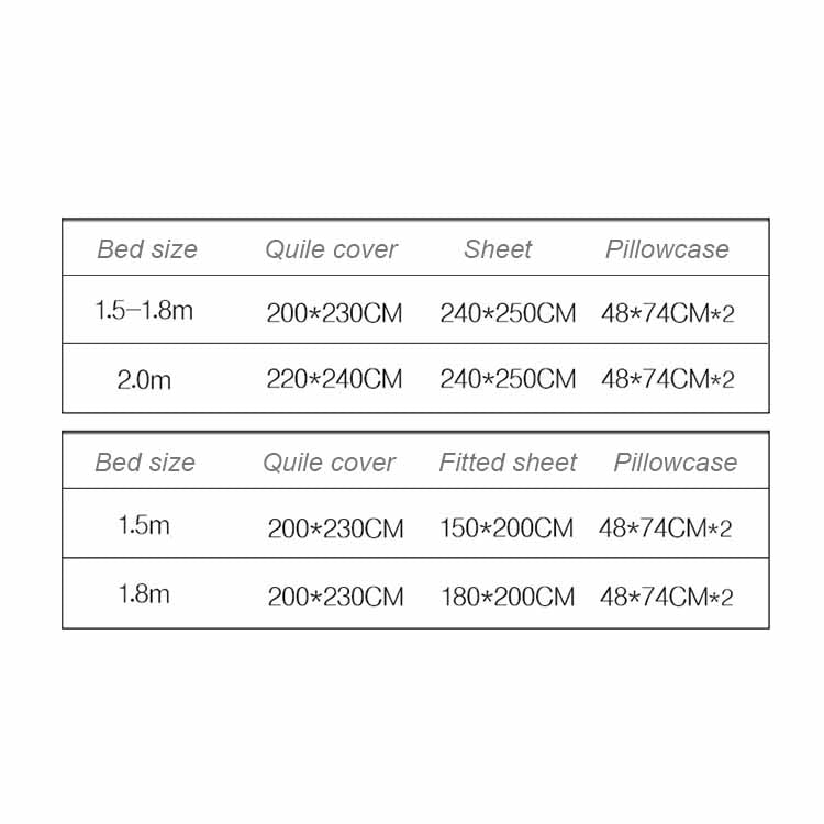 4pcs Set1(sheet): Quilt cover200x230cm or 79"x91"x1 / Bed sheet240x250cm or 94"x98"x1 / Pillowcase48x74cm or 19"x29" x2