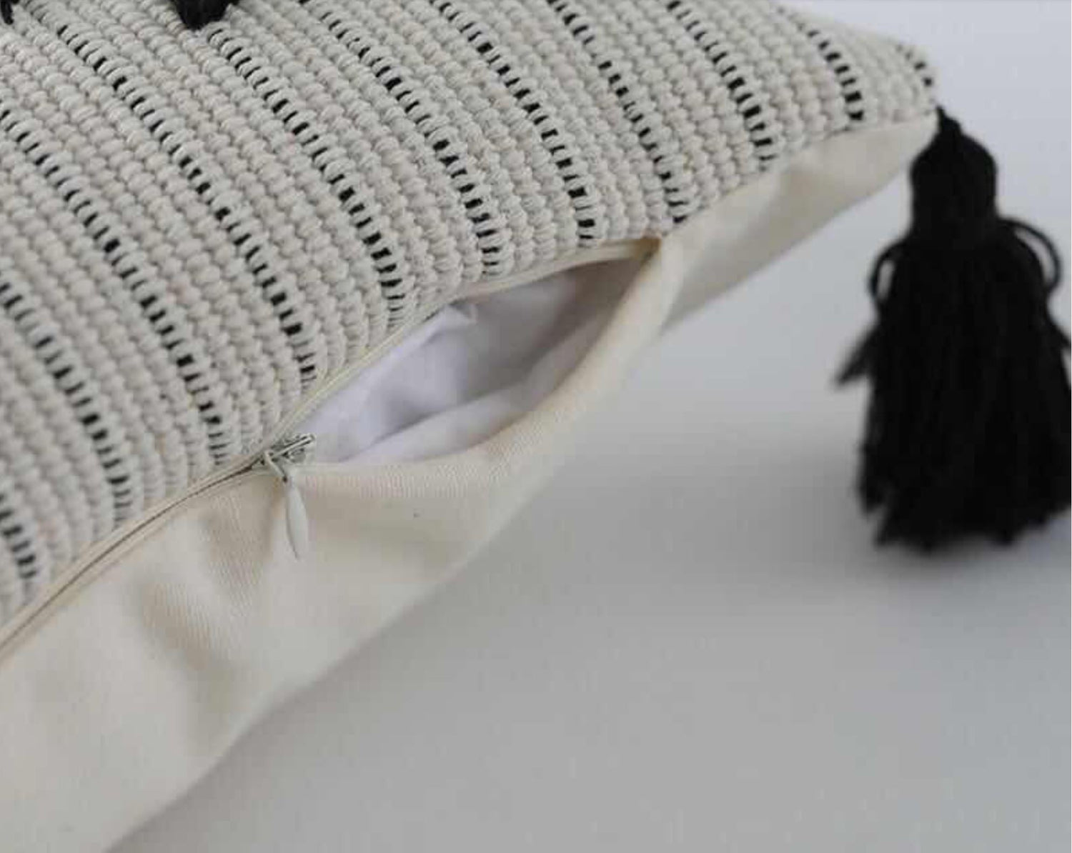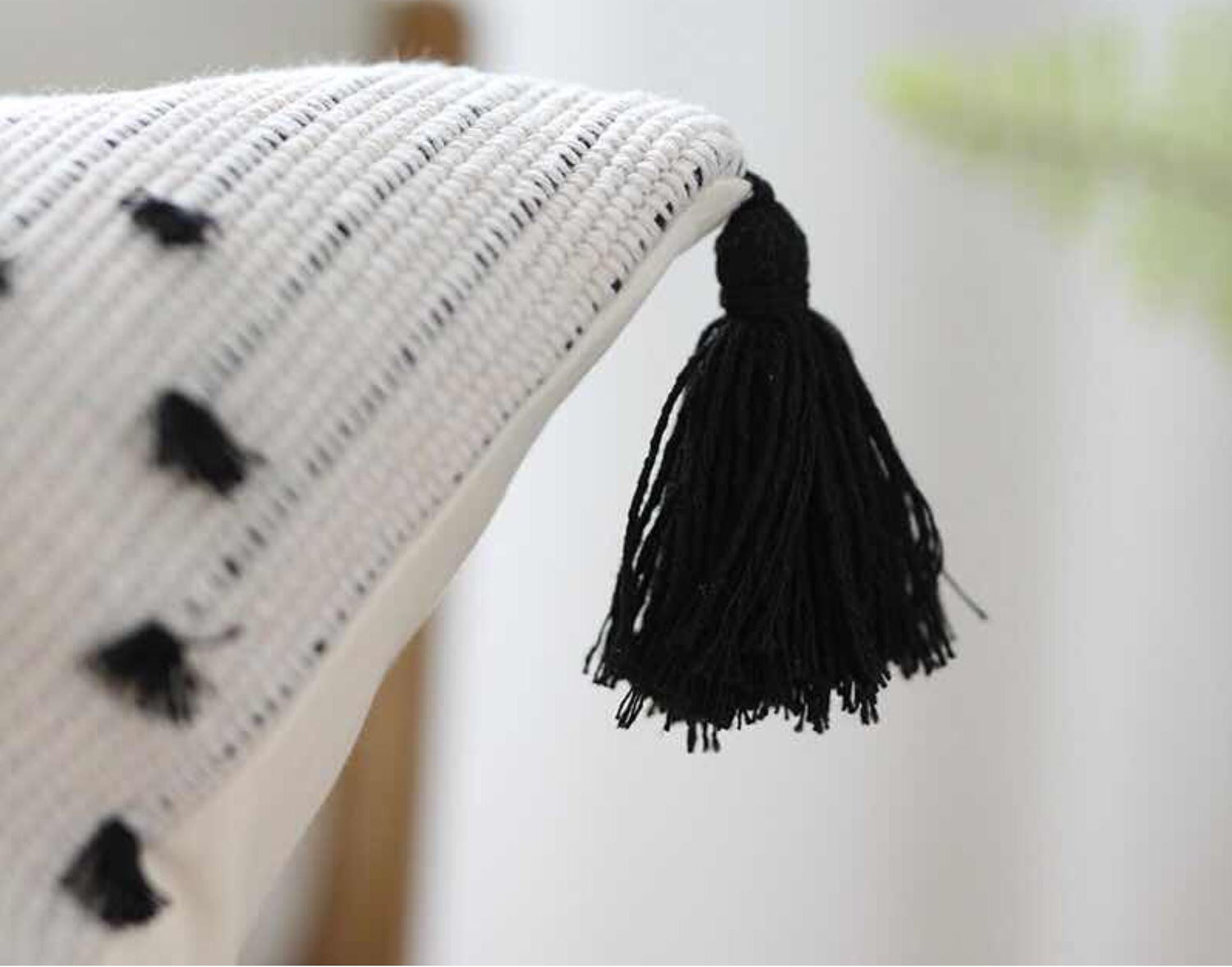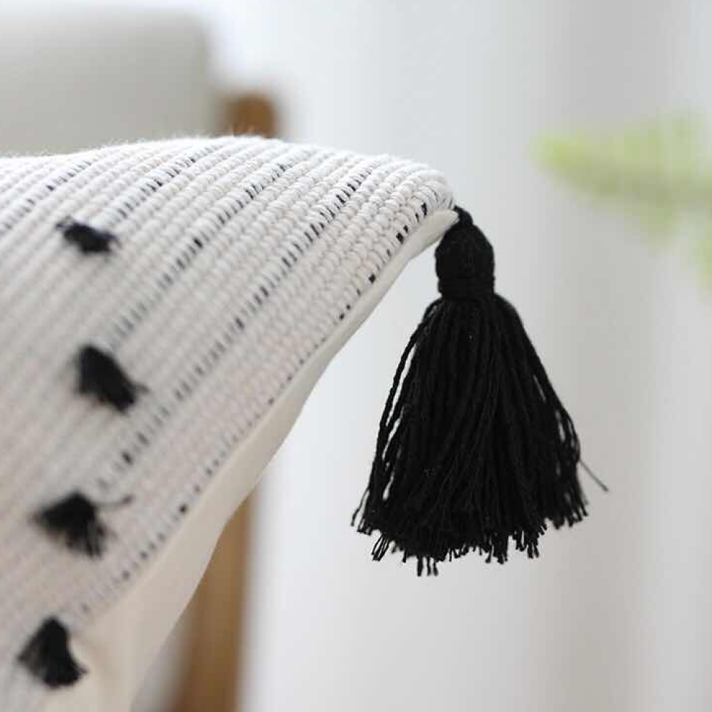 This pillow cover is hand embroidered with a subtle black dot design. The quality woven cotton and the black tassels enhance the design and give these pillows a casual elegance. The pillow covers come in two sizes. Enjoy alone, as a pair or with other pillows to make an even bolder statement.